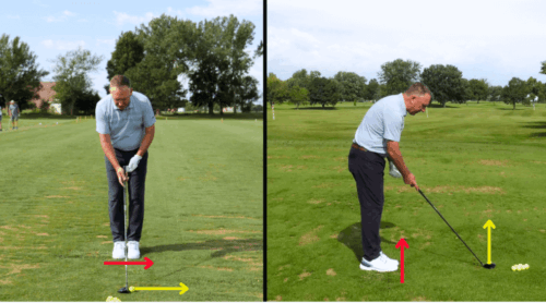 For your driver, you’re trying to hit up the ball, making contact after the low point, when the clubhead is traveling upward again.