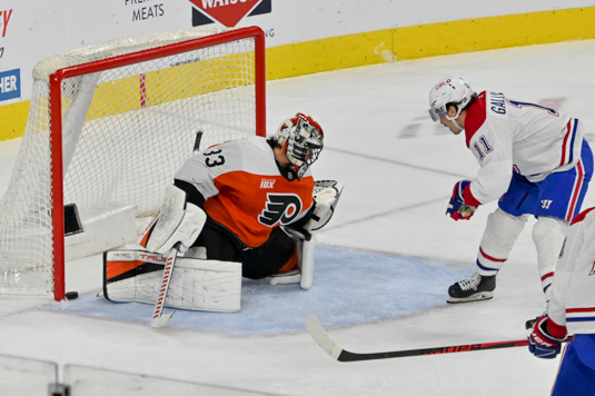 Jakob Dobes #75 of the Montreal Canadiens blocks a shot by Denver Barkey #52 of the Philadelphia Flyers