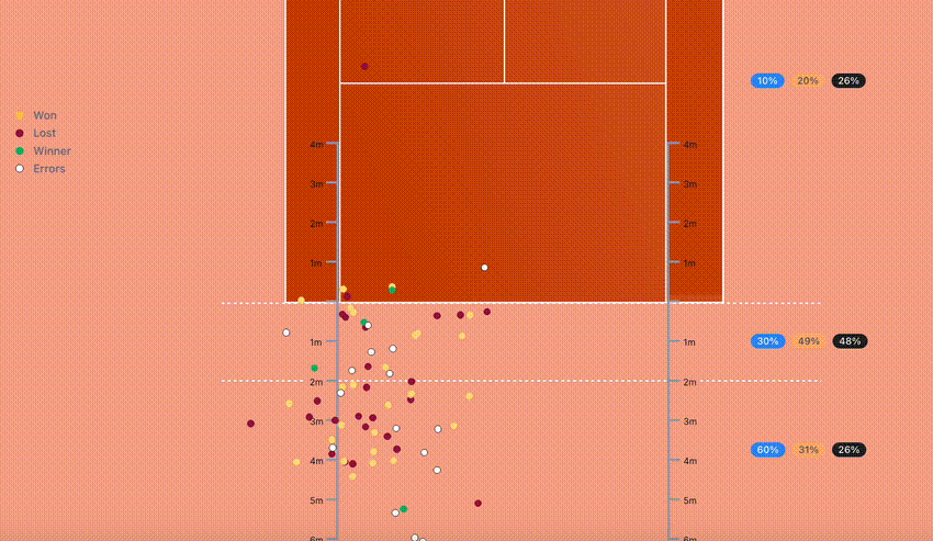 Stylistically, Fonseca and Jodar are similar: big bodies slinging the felt at triple-digit speeds and dizzying spin rates. But having seen more of both in recent weeks, there are subtle differences in how they go about their games. Jodar’s forehand is a little heavier (spin) on average, his swing is longer, and he likes to get on the front foot (left) more often, like Sinner. He averaged 3224 rpm tonight to Fonseca’s 2909 rpm (though their 52-week averages are only separated by around 150 rpm).