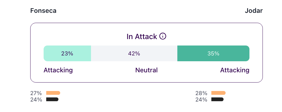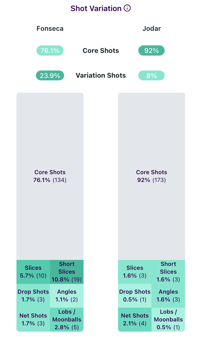 Jodar comes at you hard and fast and doesn’t let up. Look at the breakdown of their shots tactically. Jodar hit 92% of his groundstrokes as “core shots” — topspin through the baseline — compared to Fonseca’s 76%. For a comparison, when Fonseca played Sinner in Indian Wells, the Brazilian played 86.4% as core shots.