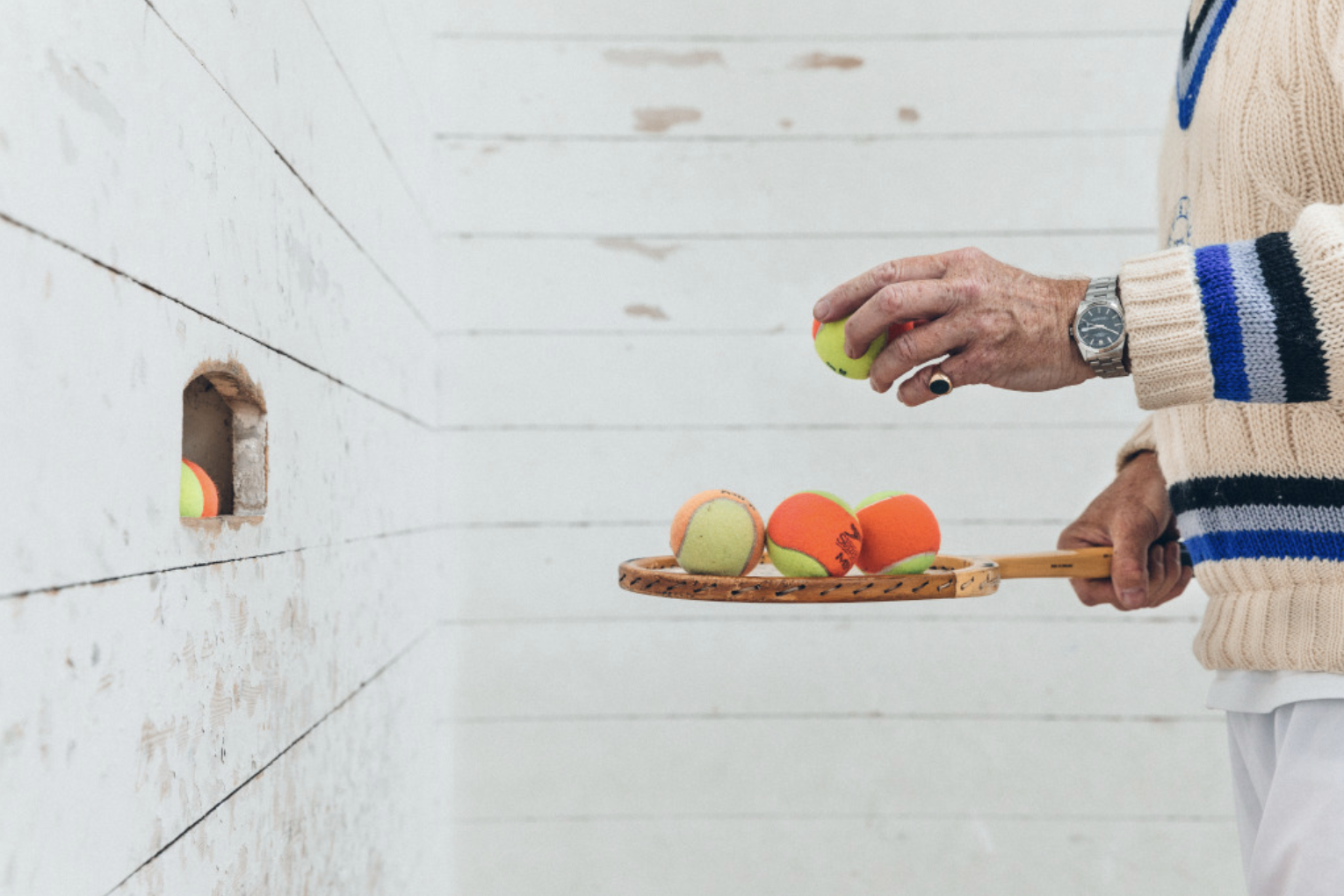 We used dark red balls. They were standard tennis balls but, for a peculiarity of history, red not yellow. An Amory family textile factory in Tiverton had always dyed the stické balls red. “They help with visibility,”Frankpitt said. The cream-white walls would have hidden a regular yellow felt ball. We played with four balls. In between points, Lawson Johnston was determined to clear each ball near the net. It was necessary because you constantly lurched forward, taking balls off the back wall. Bayfield had a habit, reminiscent of 10-year-olds, to put an extra ball right against the back wall rather than in his pocket.