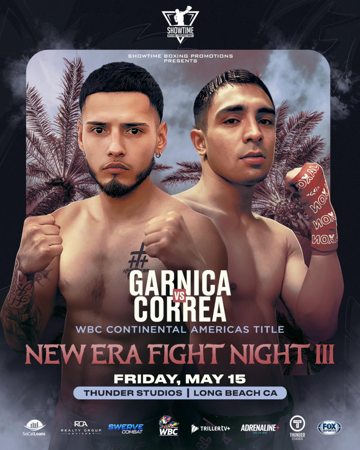 Long Beach, California — A high-stakes Northern California rivalry will take center stage on May 15, 2026, as undefeated Oakland native Anthony Garnica faces San Jose’s seasoned contender Eros Correa for the WBC Continental Americas Title at New Era Fight Night III, presented by Showtime Boxing Promotions. Taking place at Thunder Studios in Long Beach, California, the bout brings together two of NorCal’s top fighters in a pivotal clash with major implications for the bantamweight division. The event will be televised live on FOX Deportes, bringing the action to a national audience.