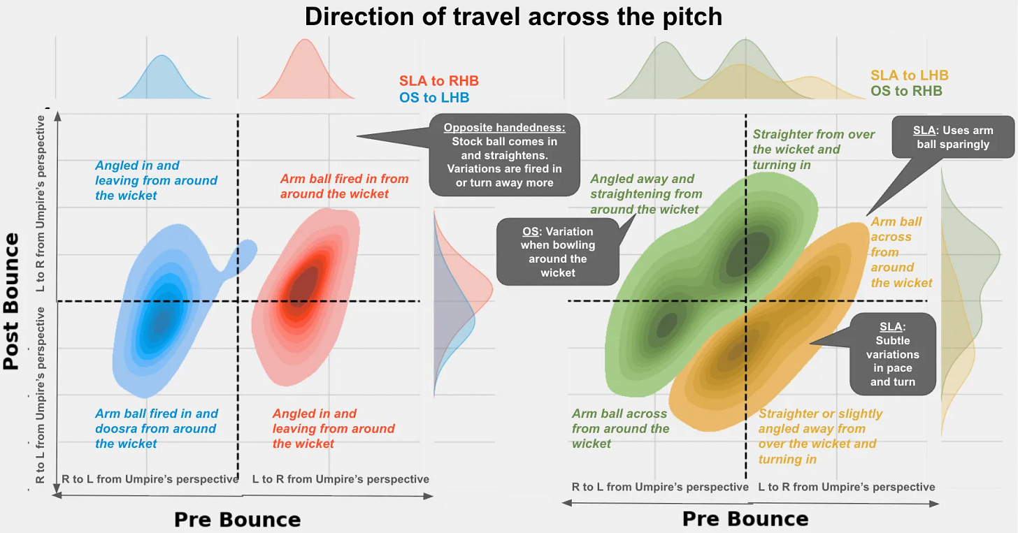 Look at this incredible graph! Itâs a bounce map for off-spinners (OS) and slow left arm orthodox spinners (SLA) to both RHBs and LHBs. Iâve never even seen a graph like this before – just explaining it could be an entire story. And yet, itâs just a preamble for Desaiâs piece. Itâs a really good – if dense – analysis.