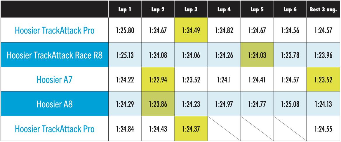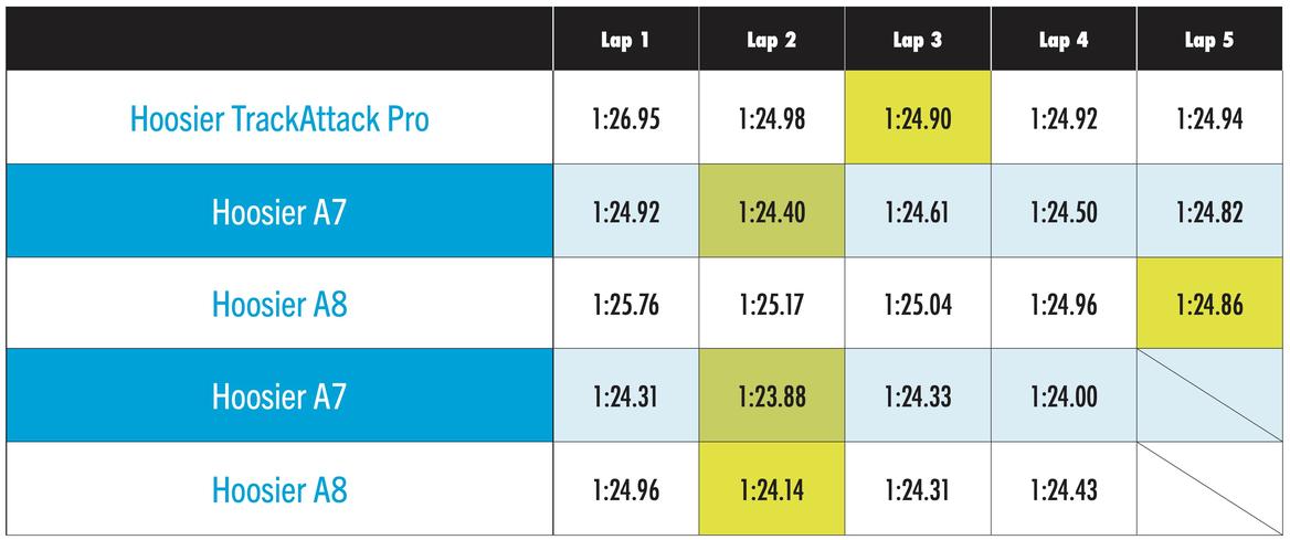 By now, we were perplexed and worried that track evolution had crept into our data integrity. So we bolted on our bracket tires for a retest and perfectly duplicated our first session’s early laps. With some residual core temp in the tires, full grip was already there for lap 1 after an aggressive out lap.
