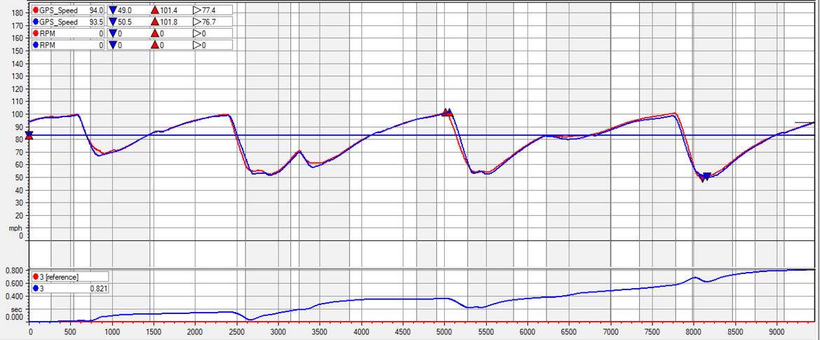 Note how the Hoosier A7 (red trace) has better grip in the center of the turn and then rolls power better coming off. This gains time all the way down each straight over the A8 (blue).