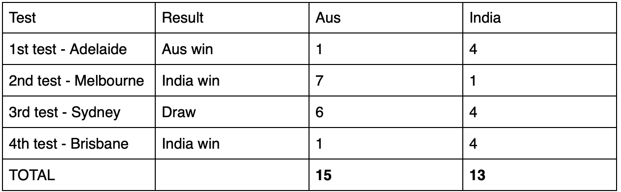 The Brisbane test match was certainly the most evenly matched one in the series. India made a huge mistake by dropping Labuschange when he was on 37 and he went on to score 71 more runs. That was very costly. But luckily for India it happened in the first innings and they were able to make up lost ground and catch up. However, Australia (Tim Paine here) again missed a stumping to get Pant out when he was on 16. It was not an easy chance but definitely a chance. Pant, of course, went on to score 89* and clinch the series for India.