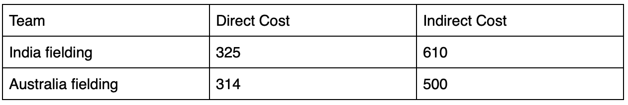 Let us look at the indirect cost. What is indirect cost – If a catch is dropped, the partnership is not broken as well. So the indirect cost takes into account the entire team score from the time the catch was dropped to the time when that batsman actually gets out. For example, if Kohli were to be dropped at 5 and the score was 50/2 and then he goes on to make 40 and gets out at 120/3 then the direct cost is 35 and indirect cost is 70. In this metric, India’s cost is higher than Australia’s – 610 vs 500 which again doesn’t explain why India won because of dropped catches.