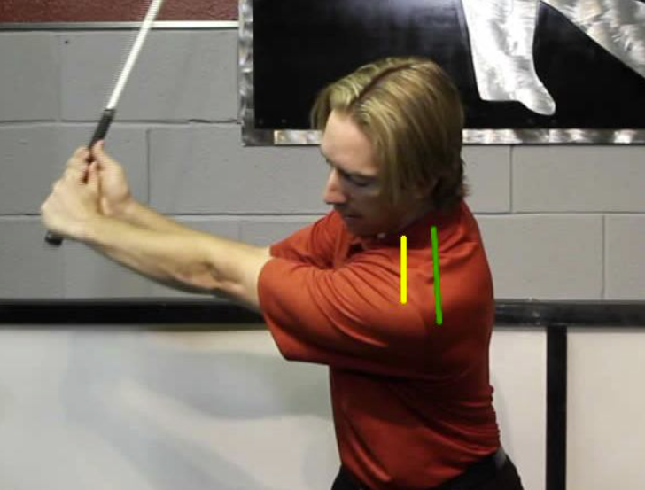 Part of this is because I’m much shorter than Tiger. Tiger’s with six one. I’m five nine. And so you’ll see that. Also because I like to hit a high draw, I shallow out the club a little bit more so you can see my right elbow has already dropped quite a bit lower. And part of this, again, is Tiger’s height. Part of this is he’s eating a much shorter club than I am.
