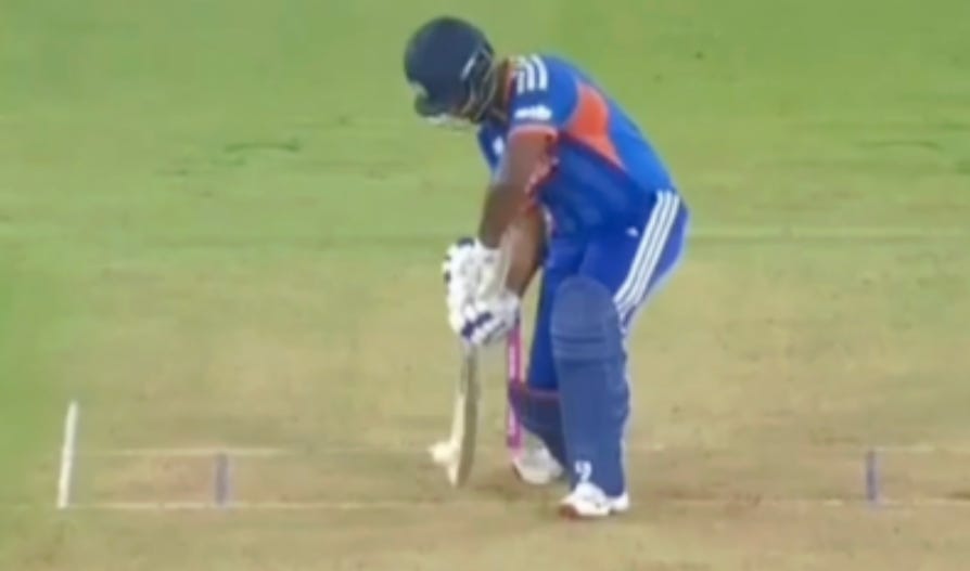 When Jimmy Neesham, the surprise best bowler for the Kiwis, was coming in to Sanju Samson, the Indian had moved across his stumps. It’s one of his superpowers, the ability to face each ball from a different place on the crease, and bowlers hate it.