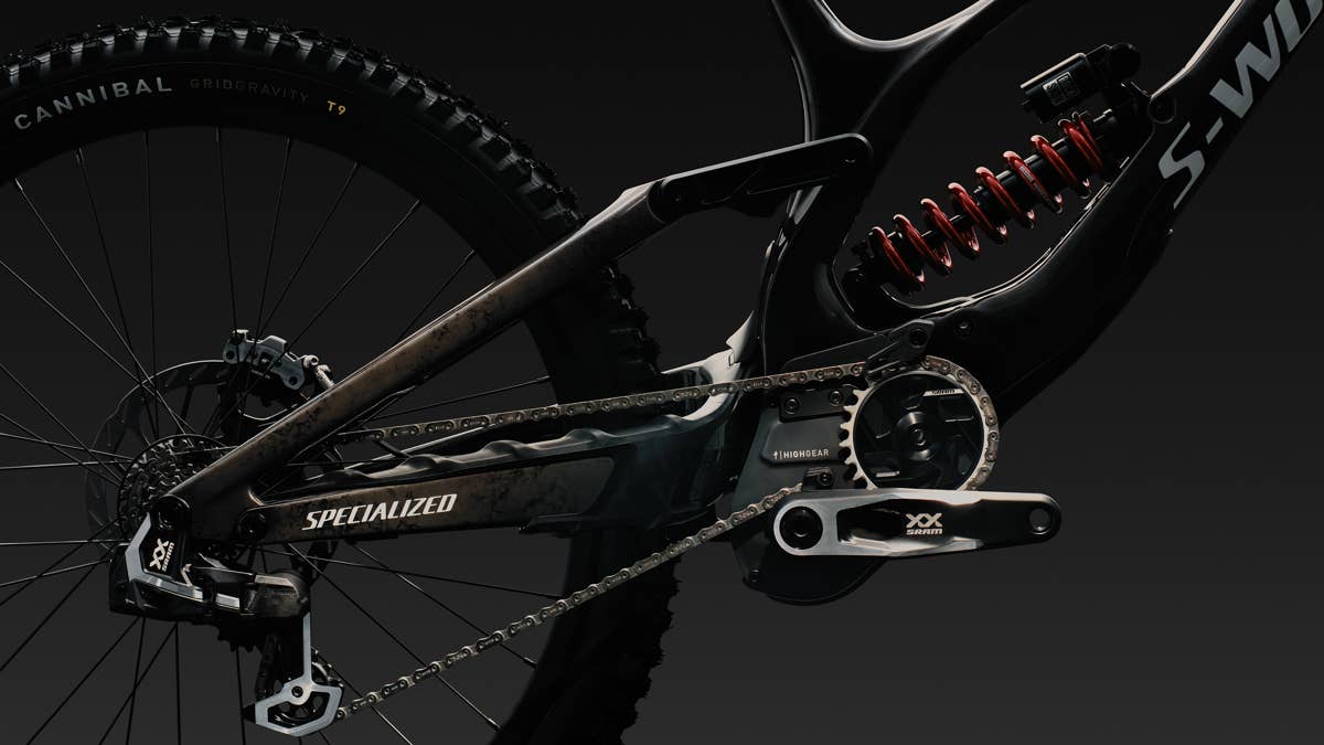 Specialized is calling this new system “HighGear”, and it’s the culmination of Specialized and SRAM teaming up to create a patent-pending system that works alongside the OBB linkage to make for a more consistent axle path and address the effects of drivetrain interference with the suspension travel. A compact chainring drives a jackshaft, which then transfers power to a final-drive ring positioned higher in the frame. It’s kind of like a high pivot with an idler, but in the mechanically impressive way that Specialized wanted to make it happen.