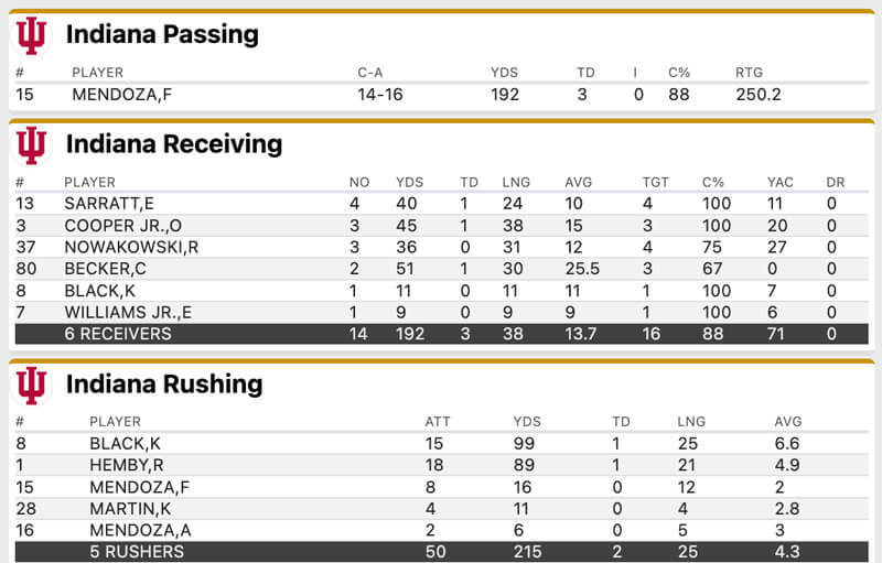 The Crimson Tide went three and out to begin the second half and Indiana needed just under six minutes to go 79 yards for a touchdown. The 10-play drive was capped off by Mendoza’s third passing touchdown of the game, a 24-yard strike to extend the lead to 24-0. Mendoza had three scrambles on the drive, totaling 28 yards.