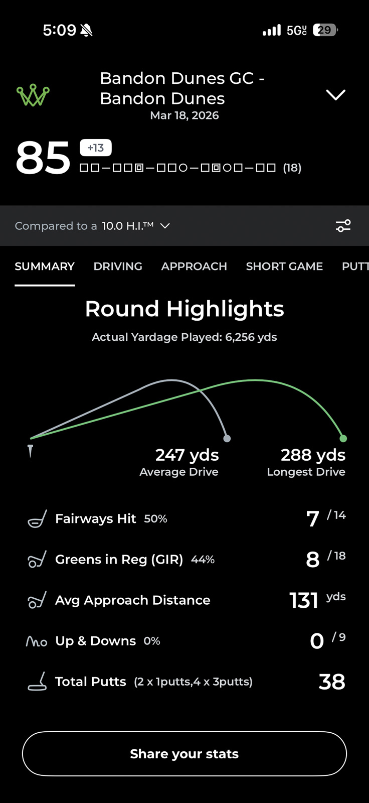 Arccos also gives you Smart Distance for each club: your expected distance on a well-struck shot, with mishits and flukes filtered out. That number on the Clubs tab is what you actually want to pull up when you’re standing over a shot on the course.