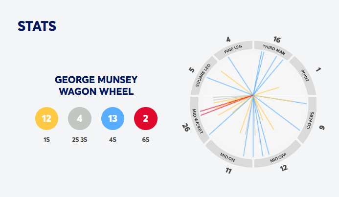 George Munsey took the bulk of the strike in the first six overs. He scored 41 runs off 26 balls, of which 68.2% were on the offside. Although he just scored two fours on the legside, they were really crisp shots – a pull shot in front of square & a flick off a slower ball outside off.
