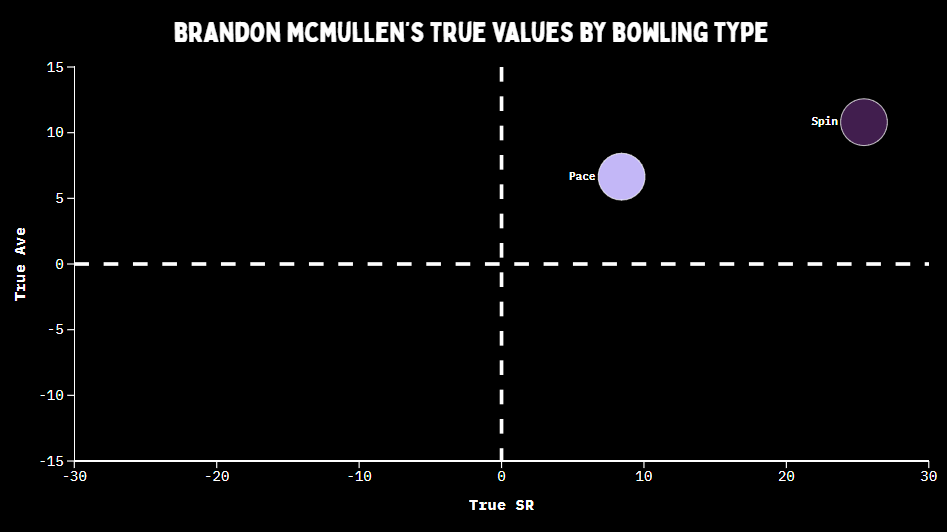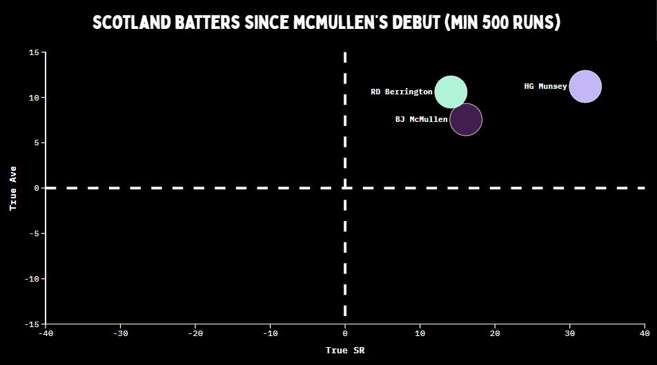 Before today, Brandon McMullen had a strike rate of 145.1 at an average of 30.6 for Scotland. On our true values, we have that as +16.1 on the former and +7.6 on the latter when compared to par. Three Scottish batters have 500 or more runs since his debut. George Munsey is better on both metrics, while Richard Berrington has a superior true average. But he is still one of the most important batters of his team.