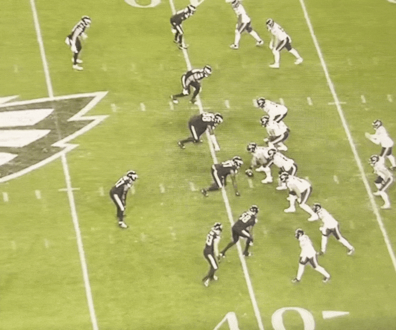 Williams first looked to Loveland, as intended, but the Eagles were in match coverage and covered Loveland tightly on his choice route.