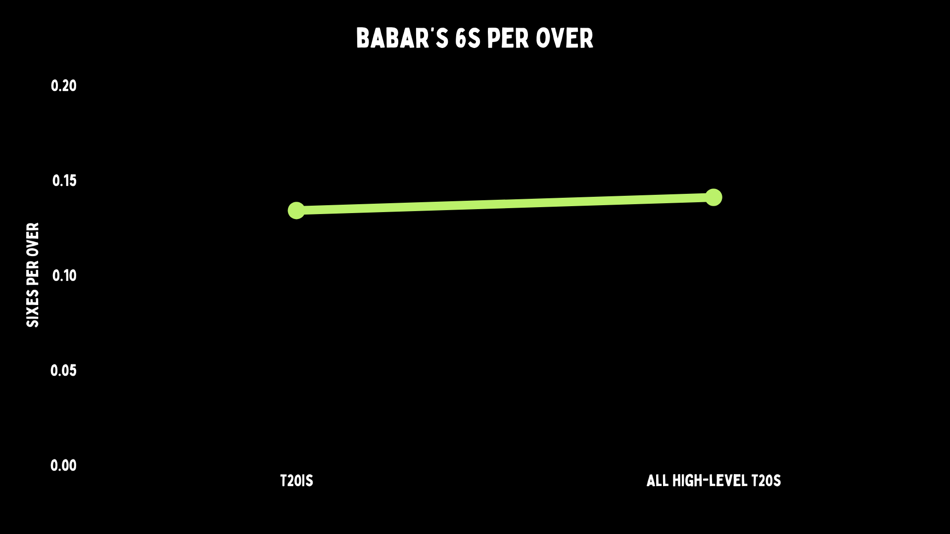 Six-hitting might be the last thing you associate with Babar Azam, even at his absolute best. He only hits 0.13 sixes per over for Pakistan. It’s just slightly better than that in all top-level T20s.