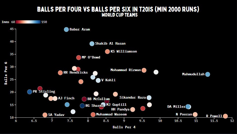 In simpler terms, he hits a six once every 45 deliveries. Over his entire career, he’s actually pretty solid at hitting fours. But routinely clearing the rope isn’t really his cup of tea.