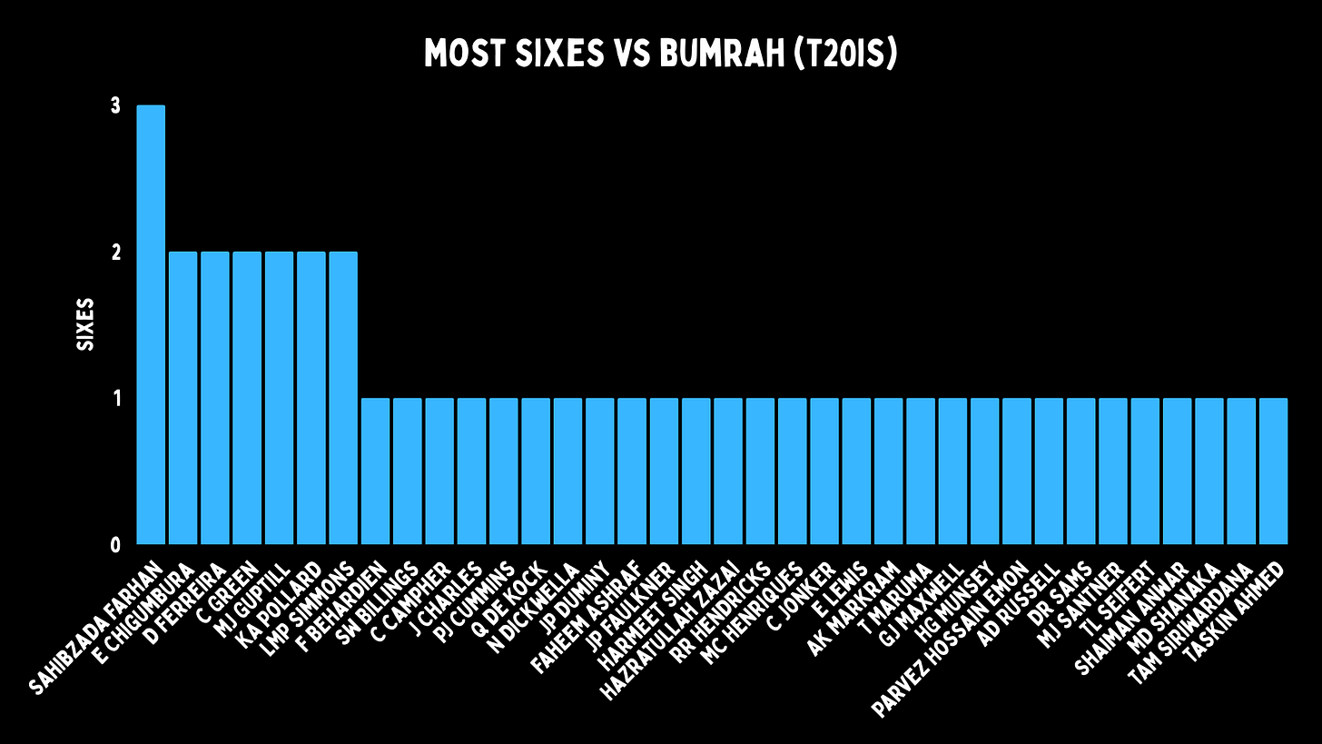 In T20 internationals, the craziest outlier that we’ve seen in recent times is Sahibzada Farhan. The opener who struck at 134 for his country last year, somehow managed to whack three sixes against Jasprit Bumrah. But it wasn’t just the sixes; Farhan actually made 51 runs off 34 balls versus him in the Asia Cup, also hitting six fours.