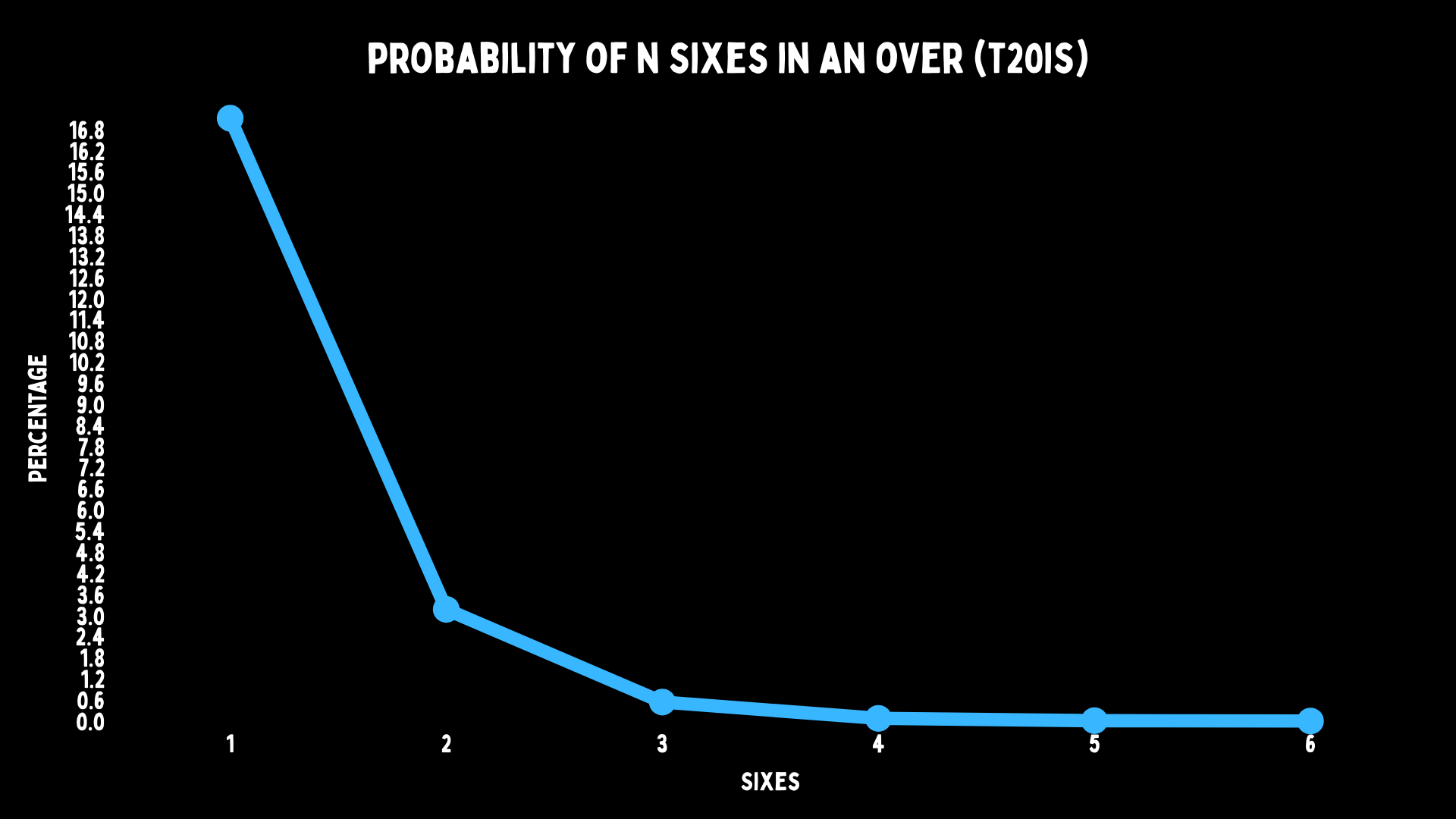 There’s a 17% chance of a six being hit in an over, and that drops down to 3% when it’s two. But we see a drastic fall after that; there’s a one in 39K chance of hitting six sixes in an over.