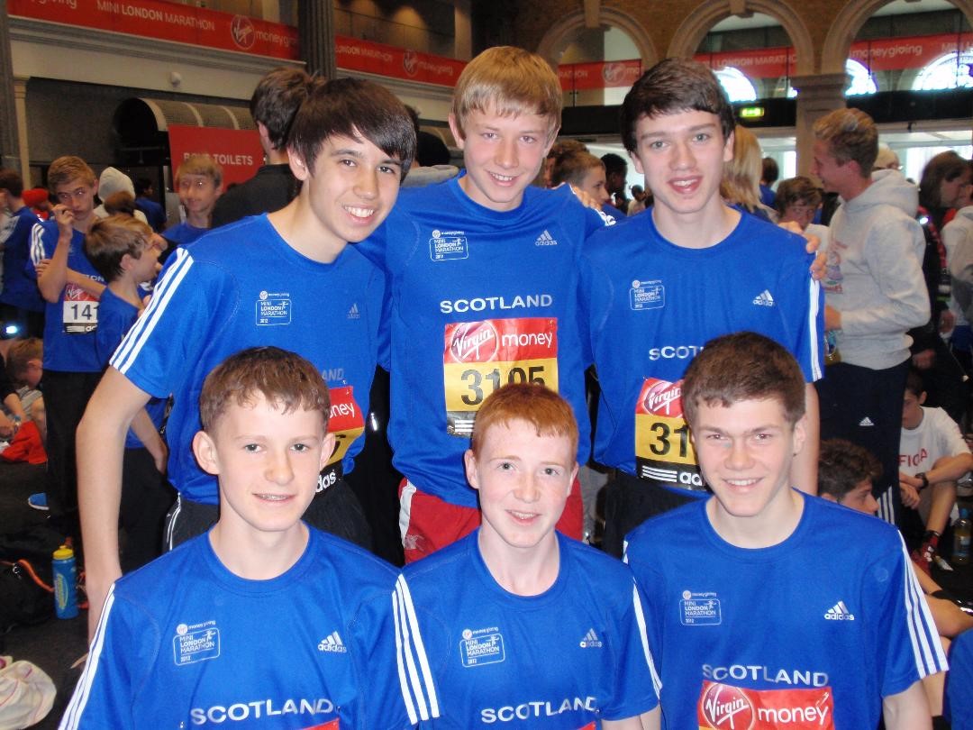 Scotland U15 Boys team at the London Mini Marathon in 2012 with Josh centre back and Jonny Glen centre front (photo by Neil Renton)