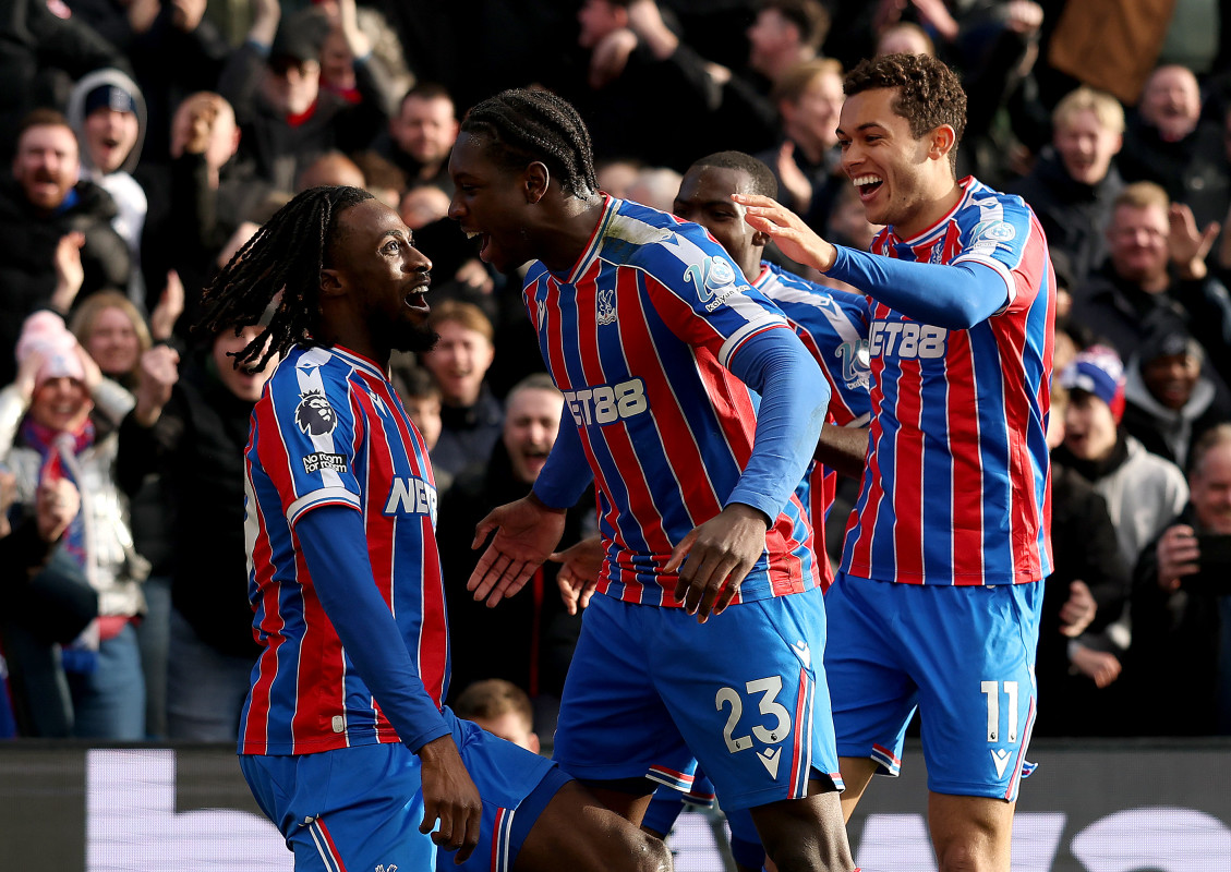 Evann Guessand of Crystal Palace celebrates with Jaydee Canvot and Brennan Johnson after scoring a goal against José Sá of Wolverhampton Wanderers during the Premier League match between Crystal Palace and Wolverhampton Wanderers at Selhurst Park on February 22, 2026 in London, England. (Photo by Luke Hales/Getty Images)