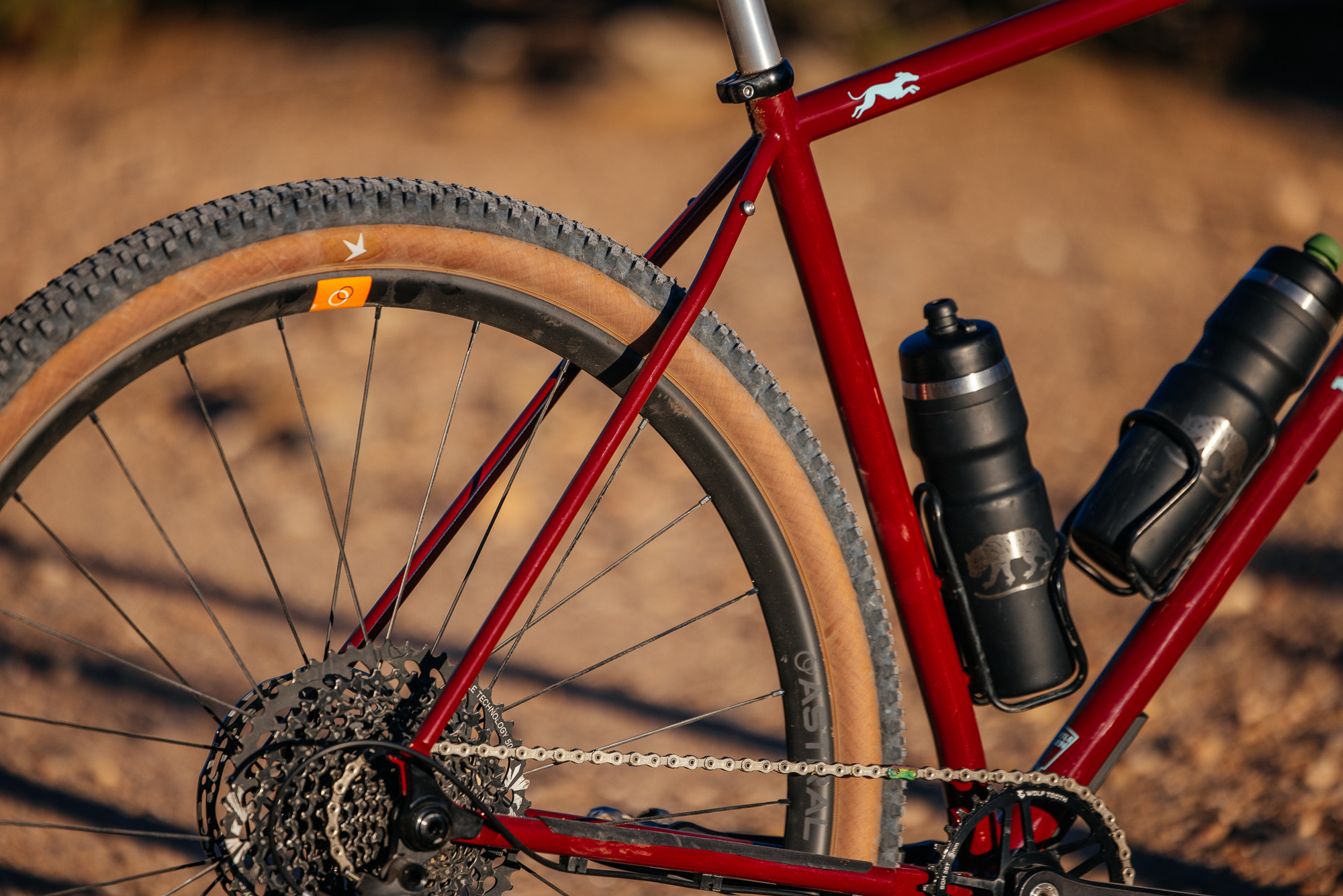 The Whippet is specced to fit a 2.25″ tire. It’s possible to squeeze in a 2.3″, depending on the tread pattern and rim width. A nice, low rolling-resistance set of rubber, run at moderate pressures, just emphasizes the frame, rather than deadens it. Feeling the Whippet corner across washboard with tires at 18 and 22 psi (front/rear) is quite the experience.
