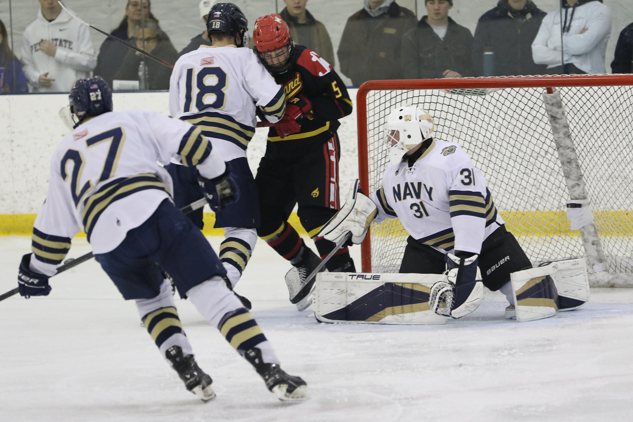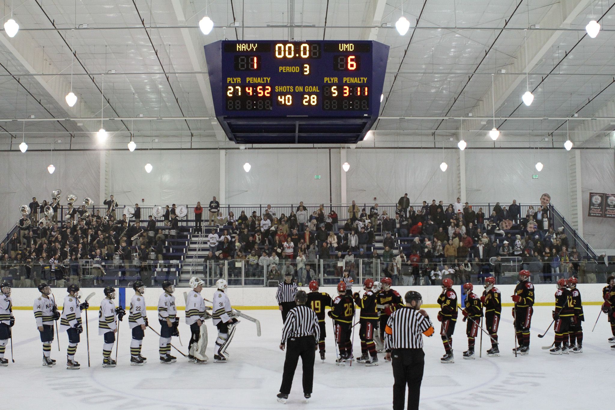 The Naval Academy pep band and packed house brought excitement and energy to the second game of the evening. Maryland got on the board first, at 15:52 in the opening period on a goal from Thomas Pilkington. Michael Shraibman provided the assist on the Pilkington goal. Just over two minutes later, at 17:34, James Botti would extend the lead with an assist from Travis Duchene. Rounding out the trio of goals from Maryland would be Colin Doherty at 19:26 with the helper coming from James Romps.