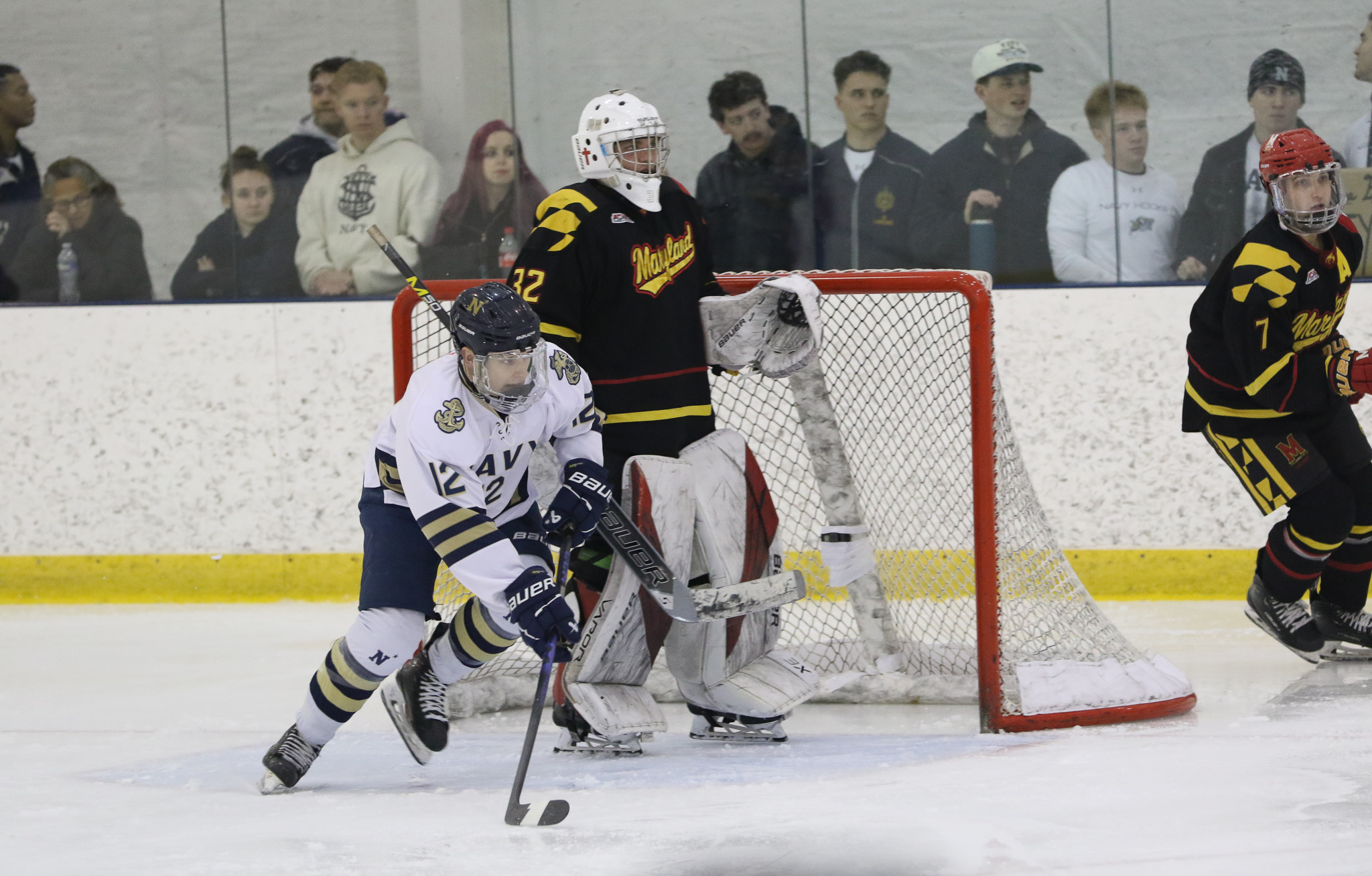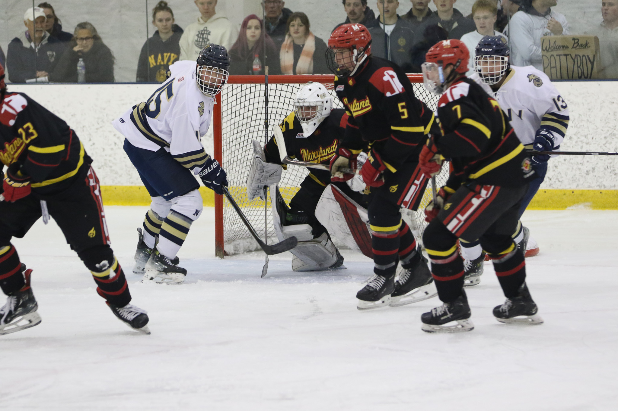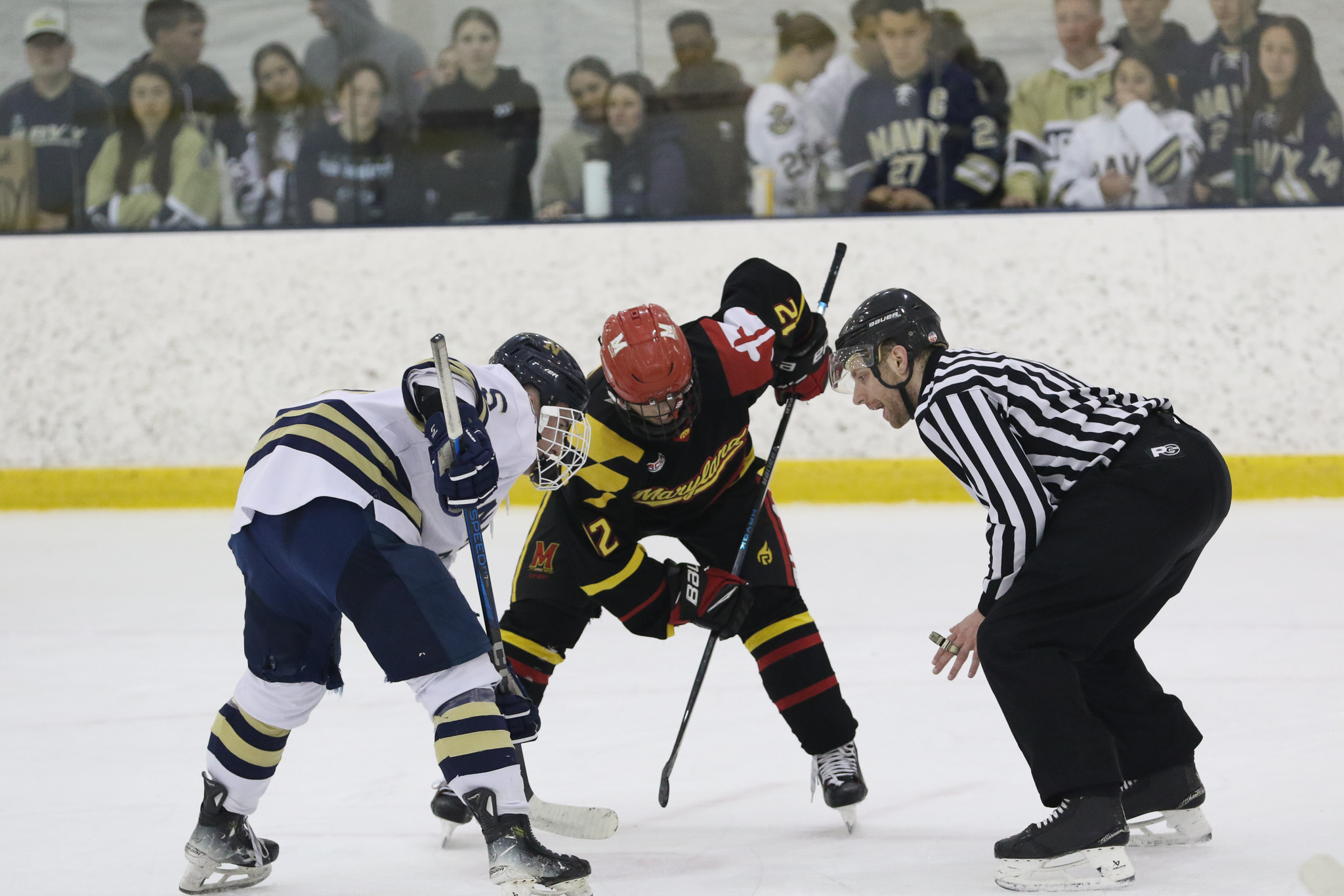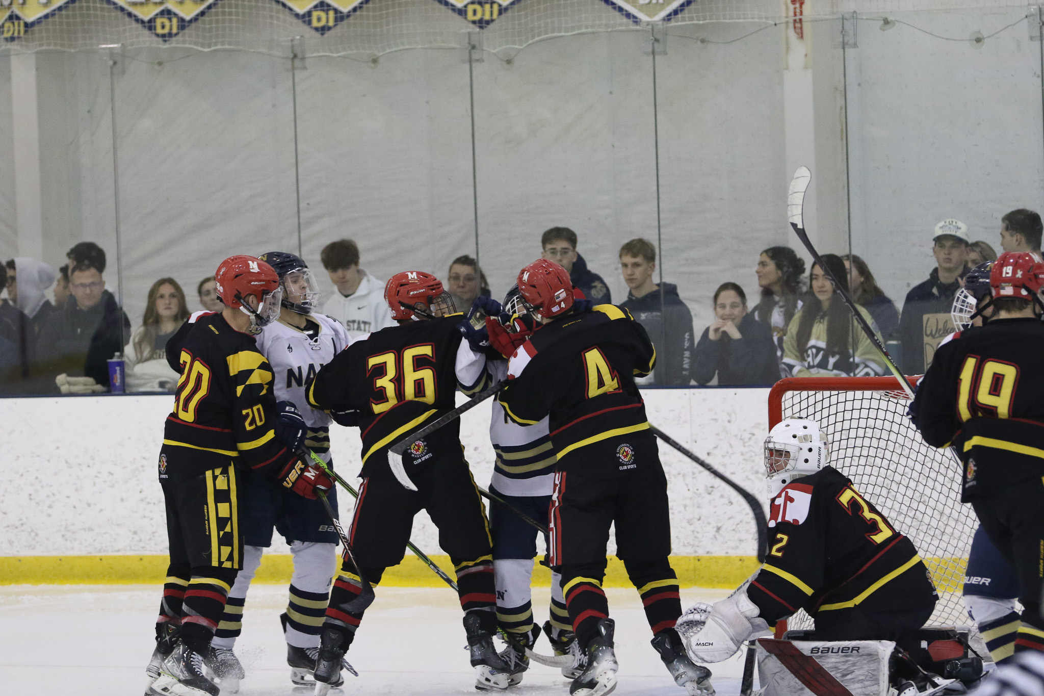 The Naval Academy pep band and packed house brought excitement and energy to the second game of the evening. Maryland got on the board first, at 15:52 in the opening period on a goal from Thomas Pilkington. Michael Shraibman provided the assist on the Pilkington goal. Just over two minutes later, at 17:34, James Botti would extend the lead with an assist from Travis Duchene. Rounding out the trio of goals from Maryland would be Colin Doherty at 19:26 with the helper coming from James Romps.
