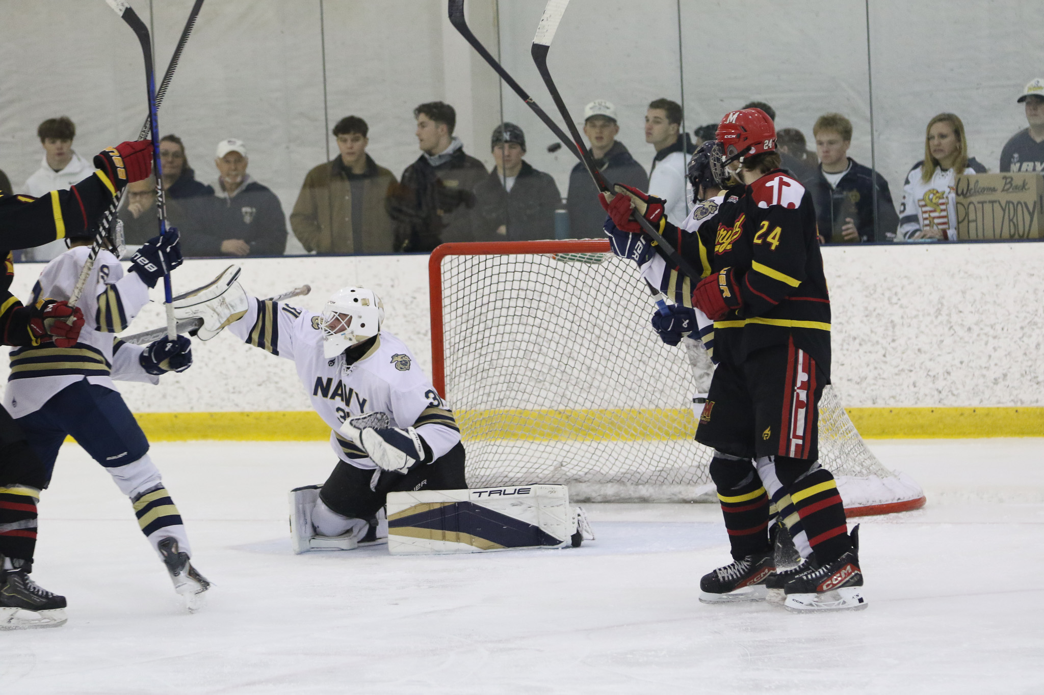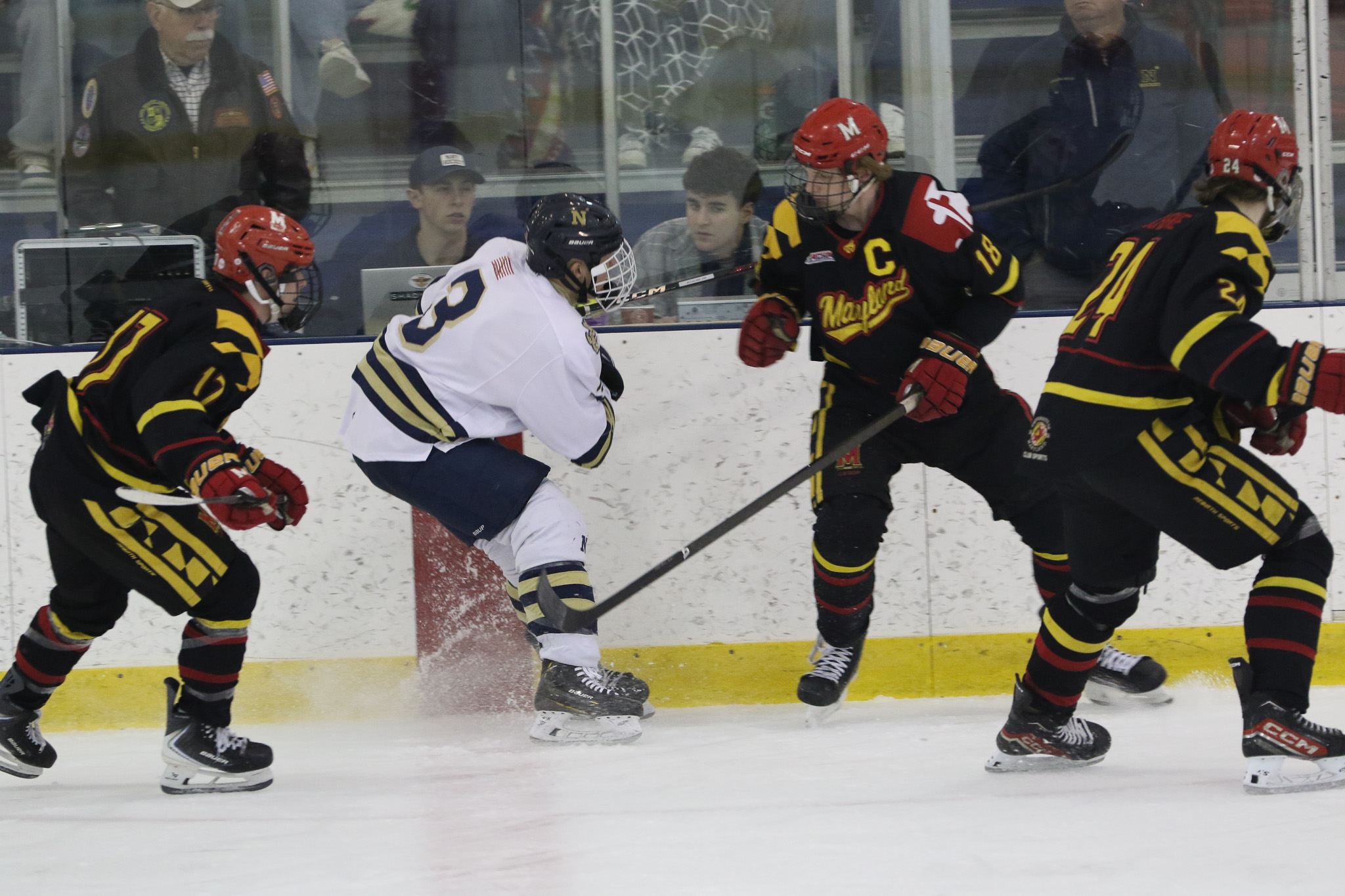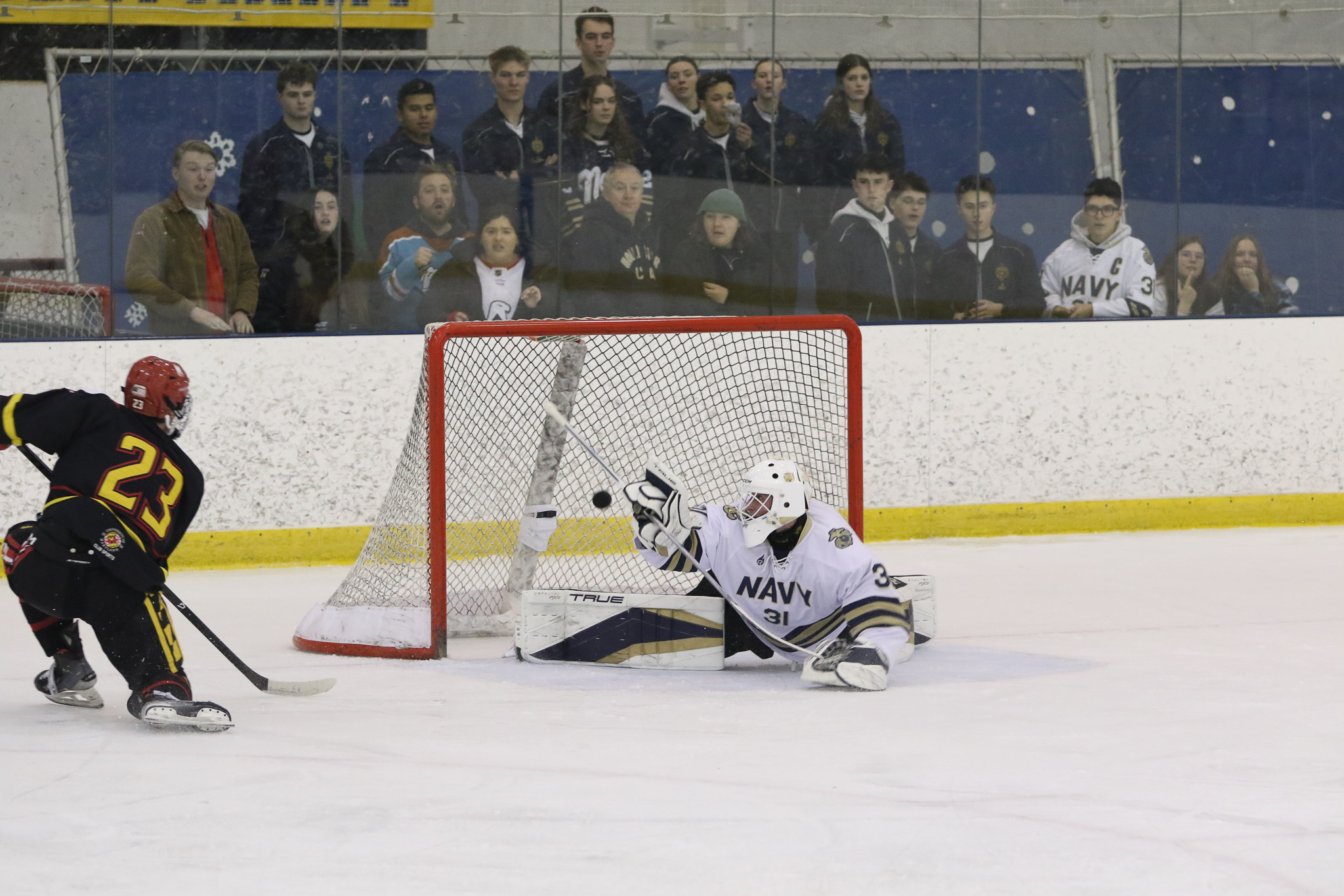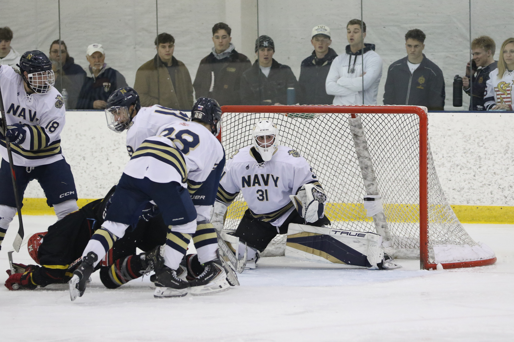 The Naval Academy pep band and packed house brought excitement and energy to the second game of the evening. Maryland got on the board first, at 15:52 in the opening period on a goal from Thomas Pilkington. Michael Shraibman provided the assist on the Pilkington goal. Just over two minutes later, at 17:34, James Botti would extend the lead with an assist from Travis Duchene. Rounding out the trio of goals from Maryland would be Colin Doherty at 19:26 with the helper coming from James Romps.