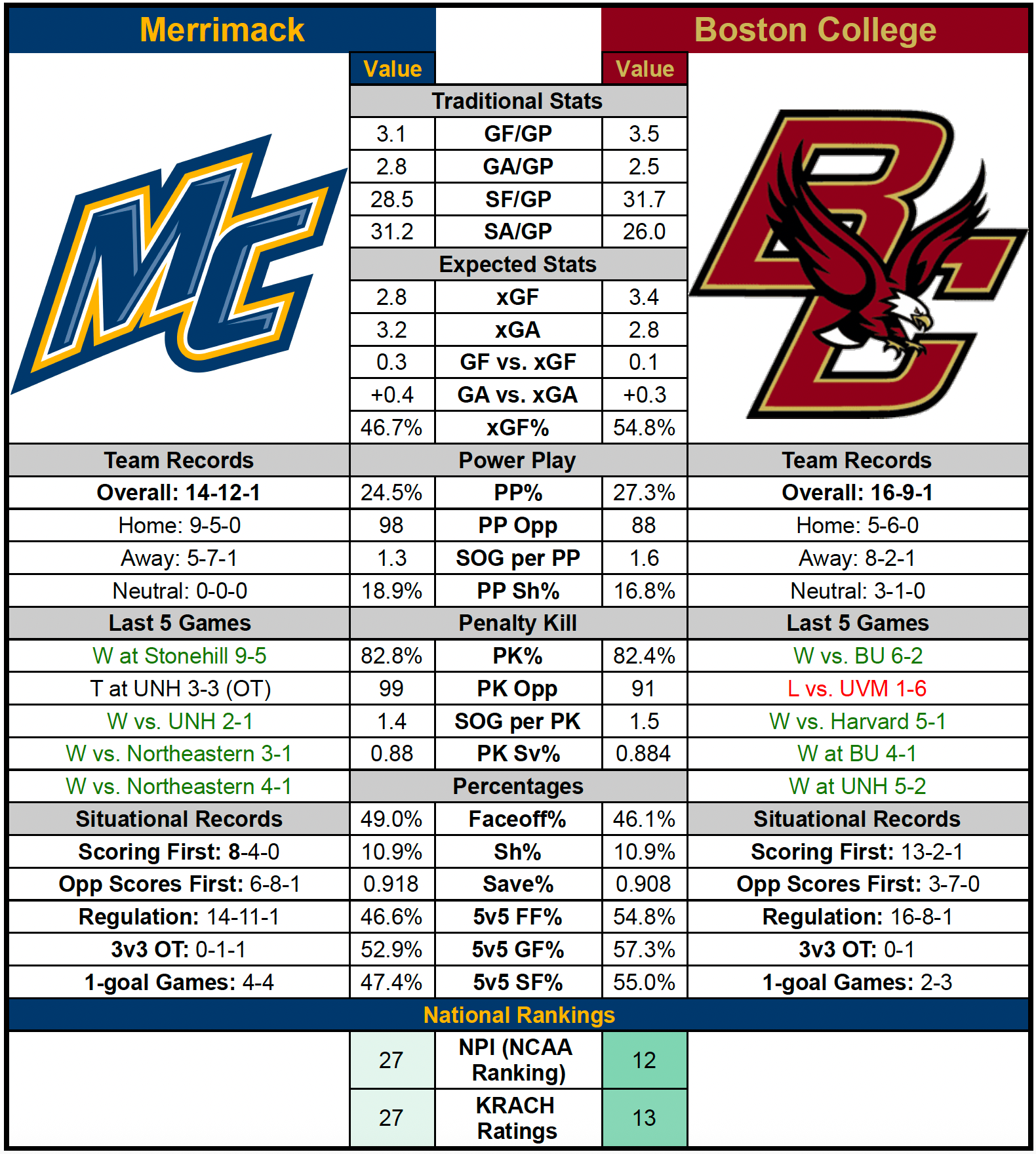 — The weekend matchup features two of the most dangerous power-play units in the country. BC enters ranked No. 7 nationally at 27.3 percent, while Merrimack checks in at No. 12 at 24.5 percent.