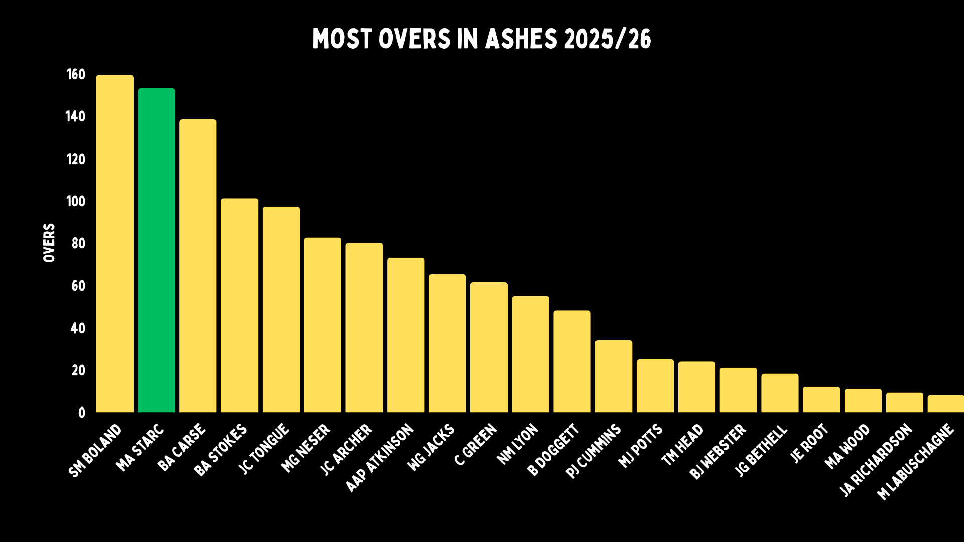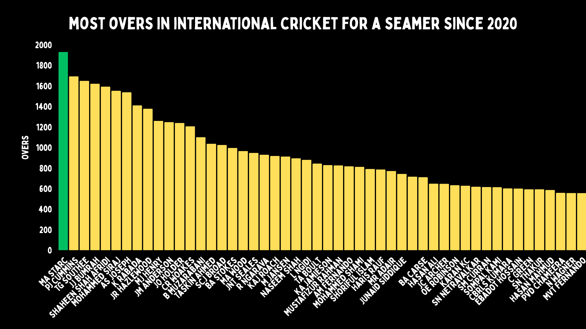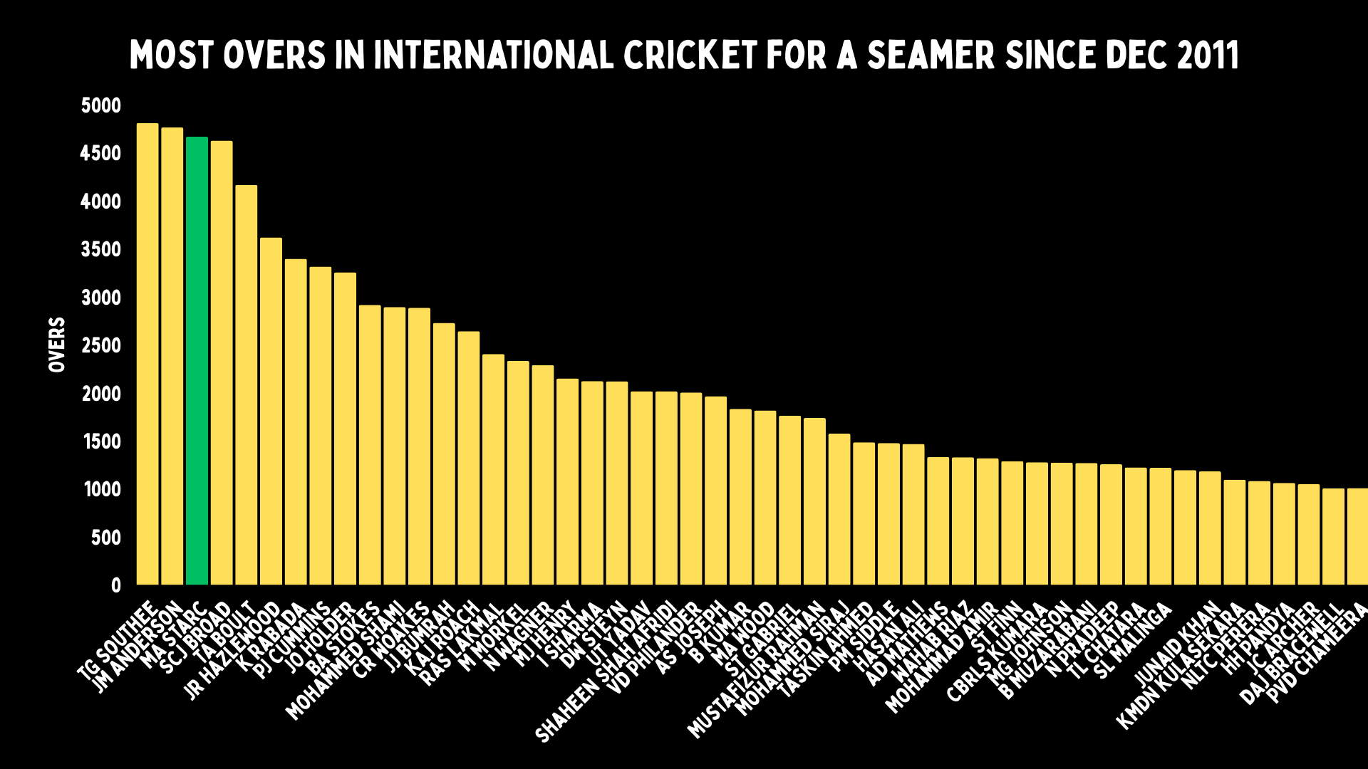 And it isn’t just that he does his work in whites. If you’ve tuned in to watch a random over of fast bowling this decade, it’s probably being bowled by him – especially at the start of games. The next-best, Cummins, is almost 220 overs less. Hazlewood is a mile back.