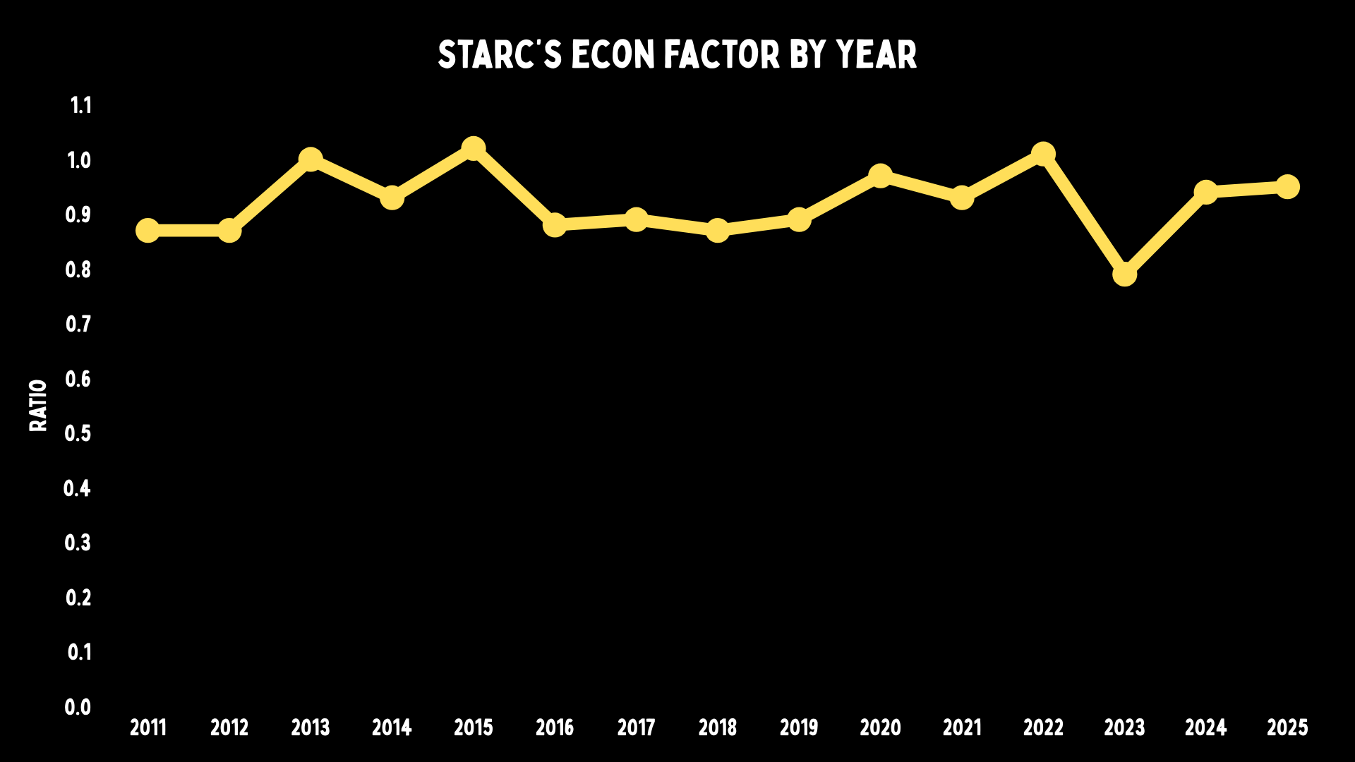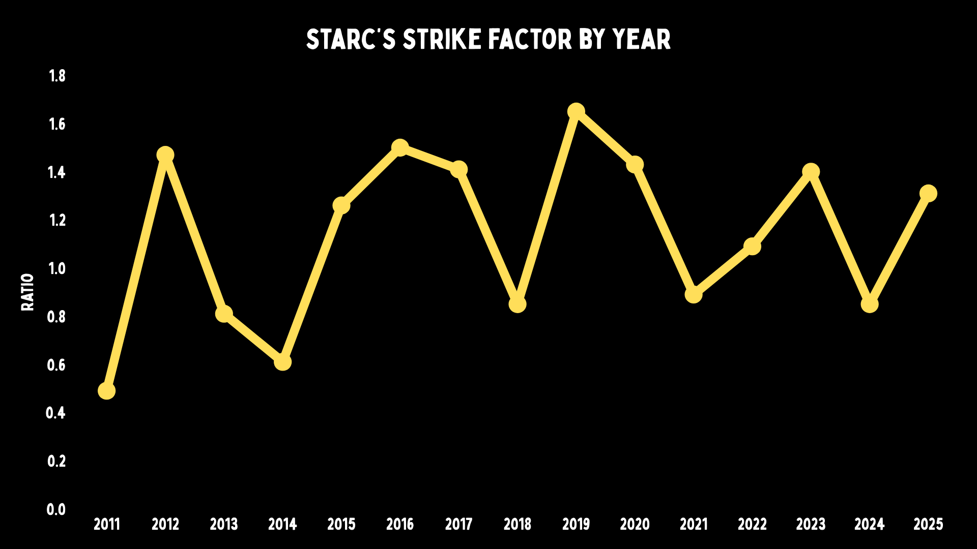 Because he is an attacking bowler, he does go for a few runs. But that profile just makes perfect sense in an attack with Cummins, Hazlewood, Boland and Nathan Lyon. The last two years have been an upgrade on 2023 in terms of control, but they’re still under par. In fact, he only ever crosses that barrier thrice, including once in 2015.