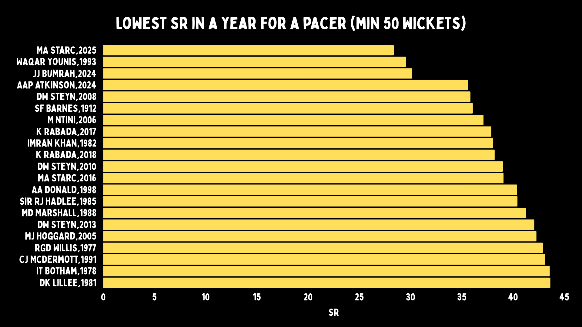 He has had a record-breaking 2025. No bowler with 50 wickets in a calendar year ever took them as fast as he did. Only him and Waqar Younis in 1993 struck at less than one wicket every five overs. But these days everyone takes them quick. The year before had incredible numbers for Jasprit Bumrah and Gus Atkinson.