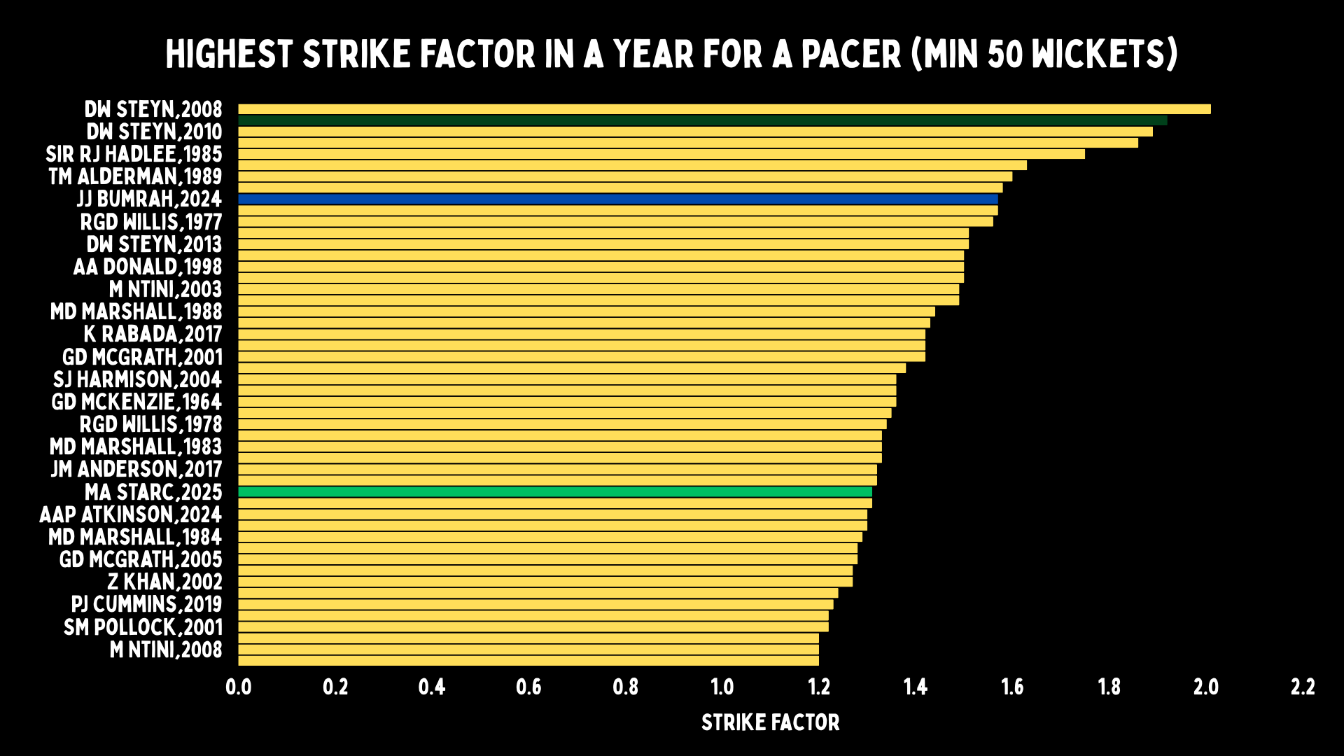He still took his wickets 31% quicker than the other seamers in his games. But for context, Waqar’s ‘93 is second place all-time, and 2024 Bumrah was up at 57% as well. Both of those bowlers were in their peaks.
