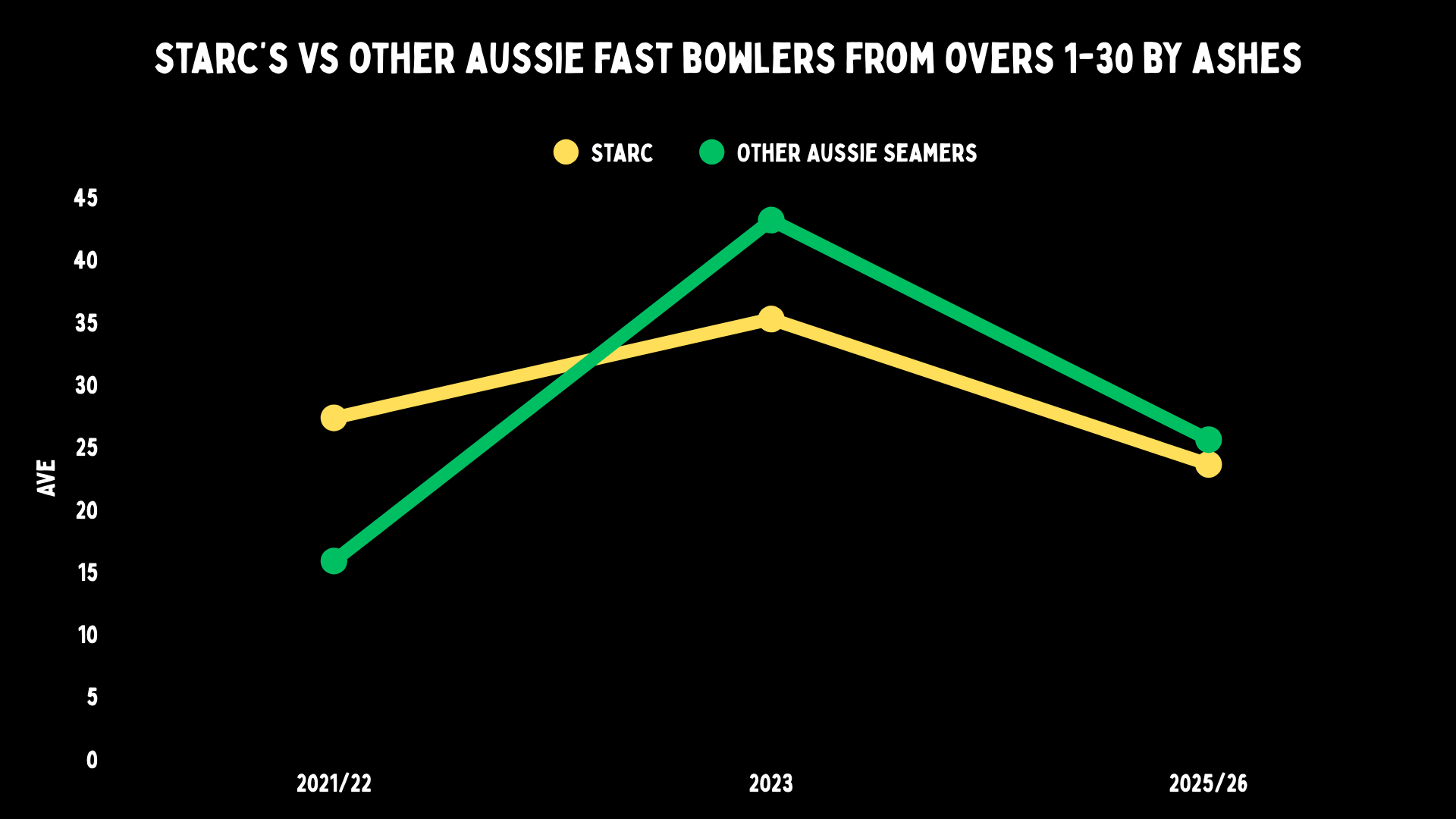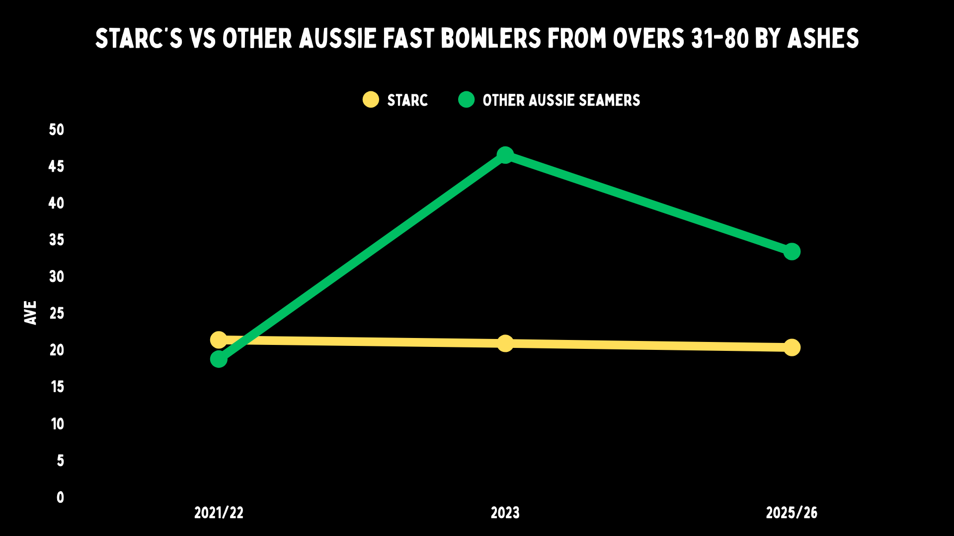 Perhaps the better way to show Starc is in overs 31-80. You can see that in 2021/22, England were terrible, and Starc was still worse than the other quicks. But in the next two series he has been incredible, because he can bowl for longer thanks to the wobbleball.