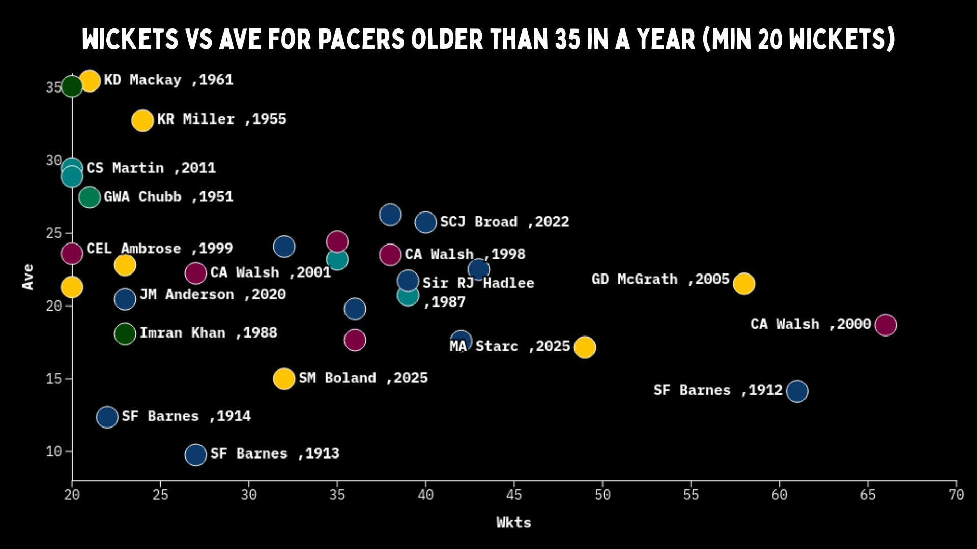 At 35 and beyond, only the legendary Syd Barnes took more wickets at a lower average. And he was a hybrid between pace and spin. Even overall, it’s just Barnes’ two more years and Boland’s 2025 where an old pacer took their wickets more cheaply.