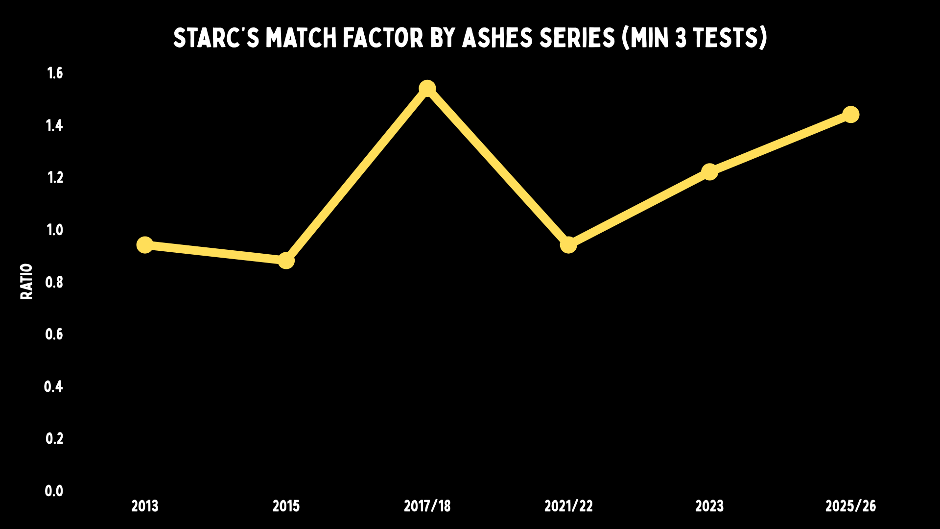 This is the lowest Starc has ever averaged against England. But we need to account for the conditions as well, and on that the 2017/18 series stands out even more. It means he has had a significant impact on three series, while being relatively middling in the others.