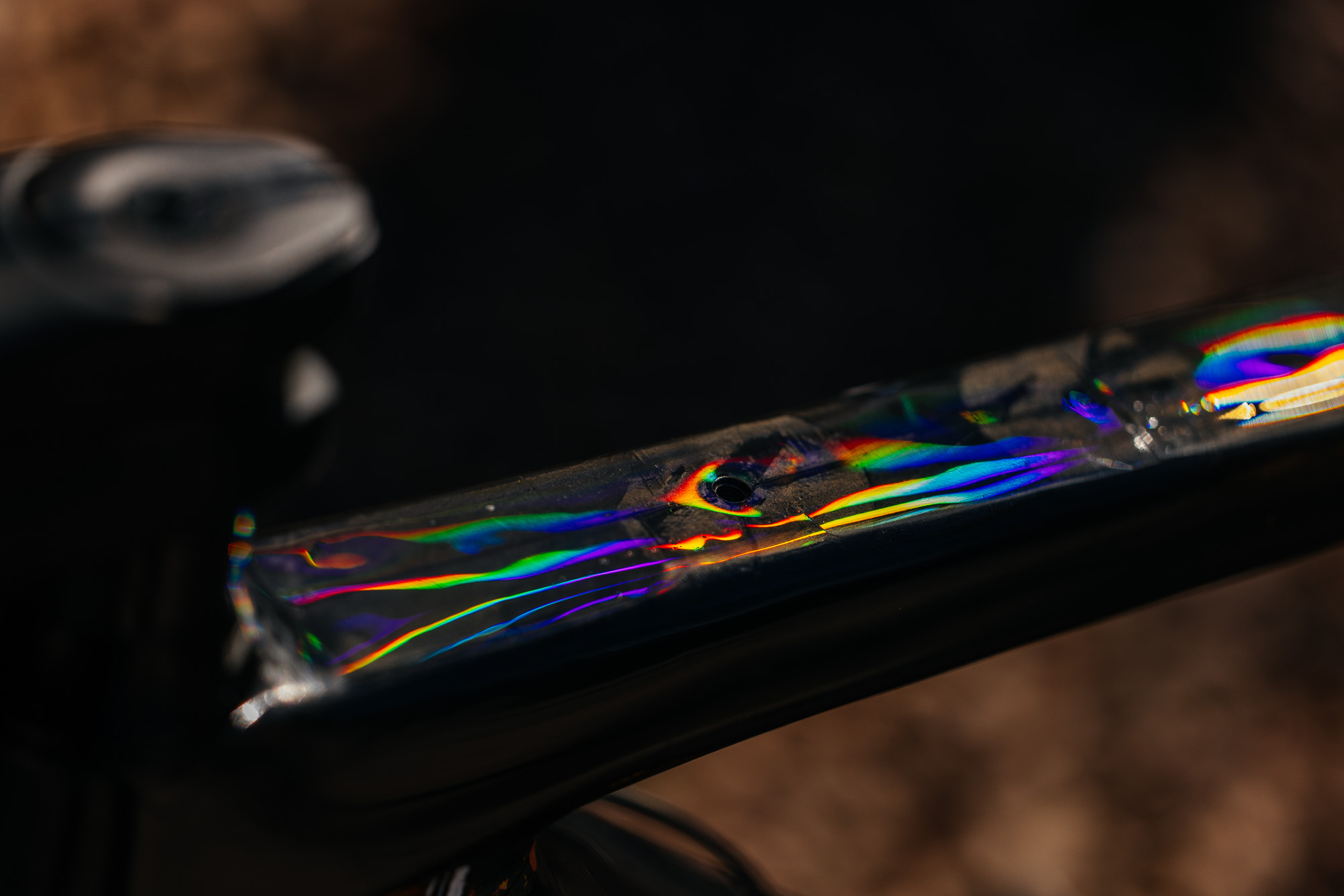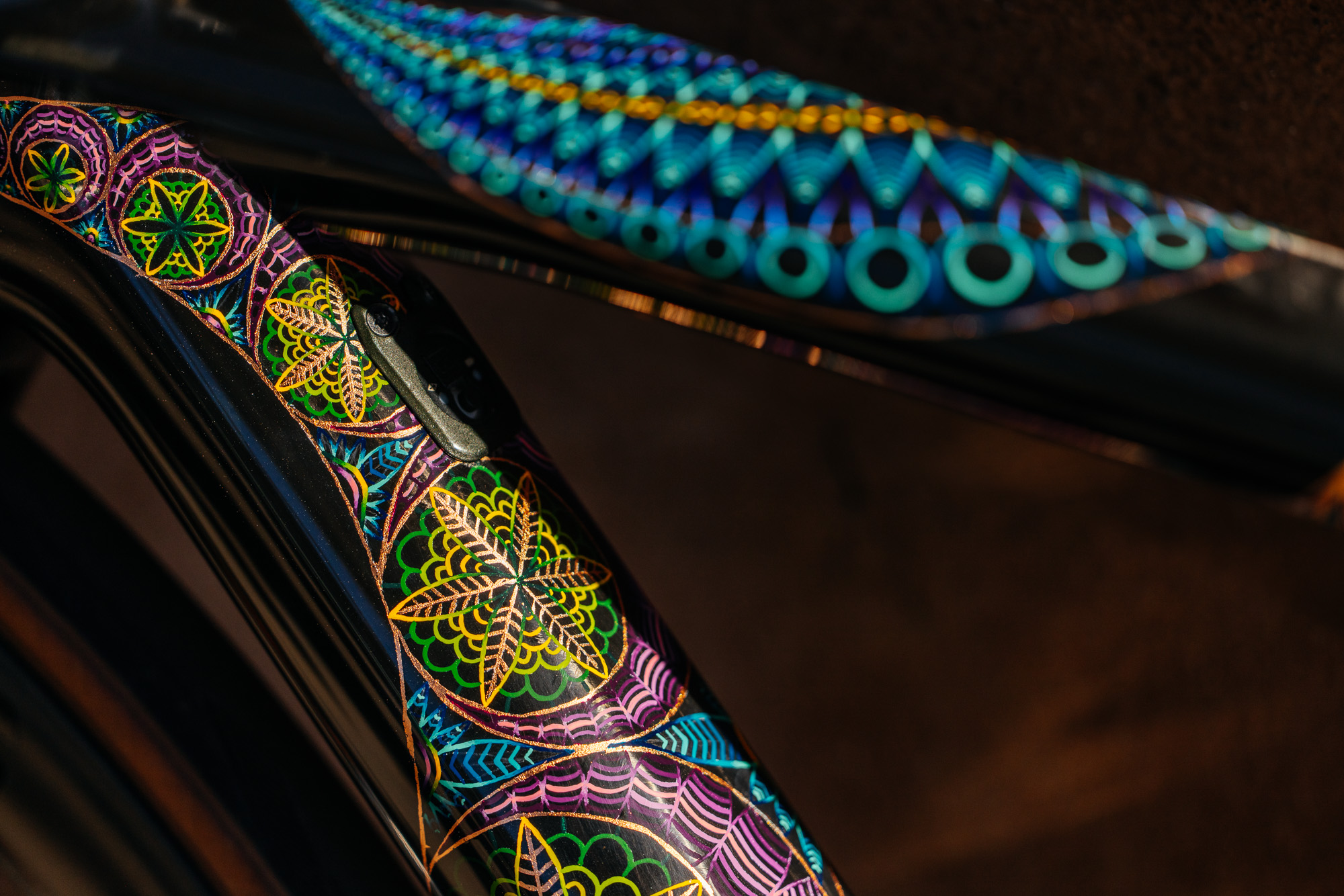 When I get to the point where a concept is becoming a theme that I can envision on a bike, I know it’s worth pursuing, and the next phase – testing if it’s possible – begins. I see every bike I’ve painted so far as a prototype. With each project, I’ve introduced a medium or technique that I haven’t tried before in any setting, much less a 3D object that must withstand constant movement, prolonged sun exposure, and (hopefully minor) impact. I test designs and material compatibility on flat carbon test boards and begin to daydream of how it will look on the complicated shape of a bicycle.