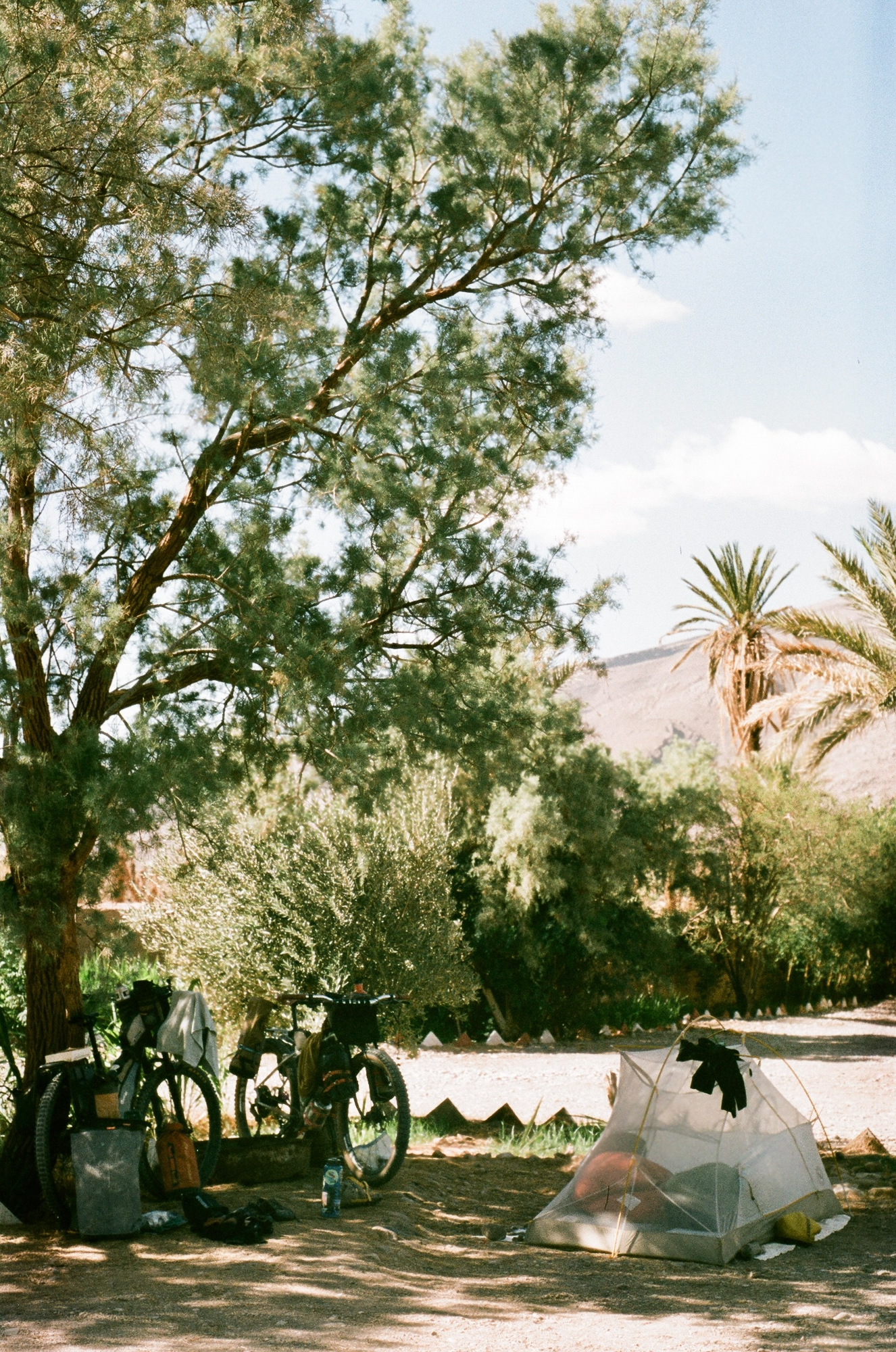 Our travel through the Sahara was uniquely beautiful: the long afternoon shadows created sensuous curves on the tall dunes, the starkness of the landscape unlike any I’d seen before. The Sahara was also sprinkled with the universal experiences of bikepacking in the desert: how lucky you feel to find relief in a patch of shade, how frustrated at pushing your bike through deep sand, and how infinite the night sky seems. After two and a half days of alternating between slogging through sand, cruising on the dry lakebed of Iriqui, and stumbling through baby-head washboards, we came out to Foum Zguid. Sitting in the streetside courtyard under an argan tree, drinking mint tea at twilight, we chatted with our new friend Majid about growing up here. He spoke about how his family were traditionally nomadic people, moving through the Sahara with the seasons depending on rainfall and resources. He told us the dry lakebed we had cruised across the day before was not that long ago filled with water and fish, making a reliable stopover for desert caravans. The lake has been largely empty for fifty years due to decreased precipitation and irrigation damming from the upper valleys, and since then many families have had to make the tough decision to leave their traditional way of life and settle in towns on the edge of the desert. The loss of water in the natural landscape due to climate change and dam diversions is an unfortunate commonality with the American Southwest; the heartbreak at losing a precious place to a dam, a throughline I wish we didn’t have to share.