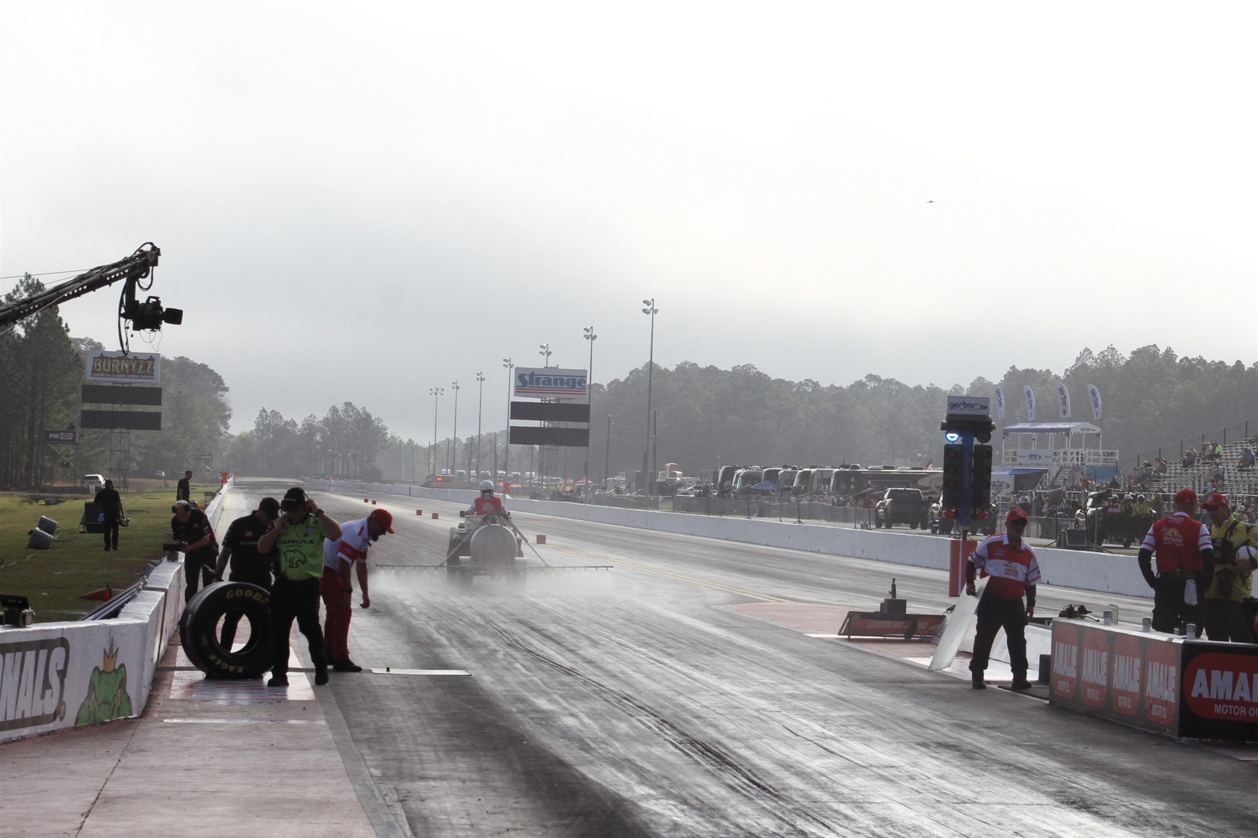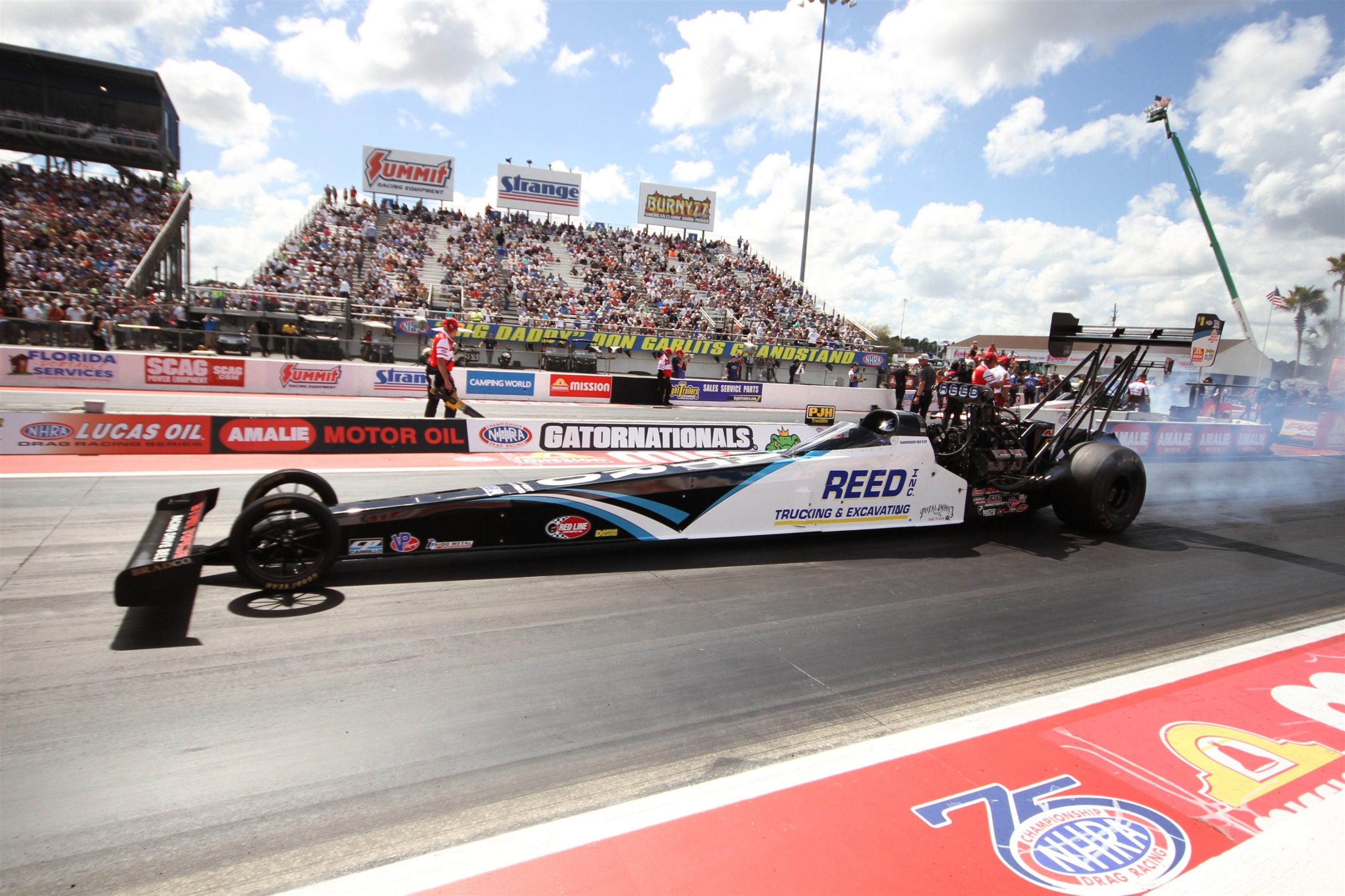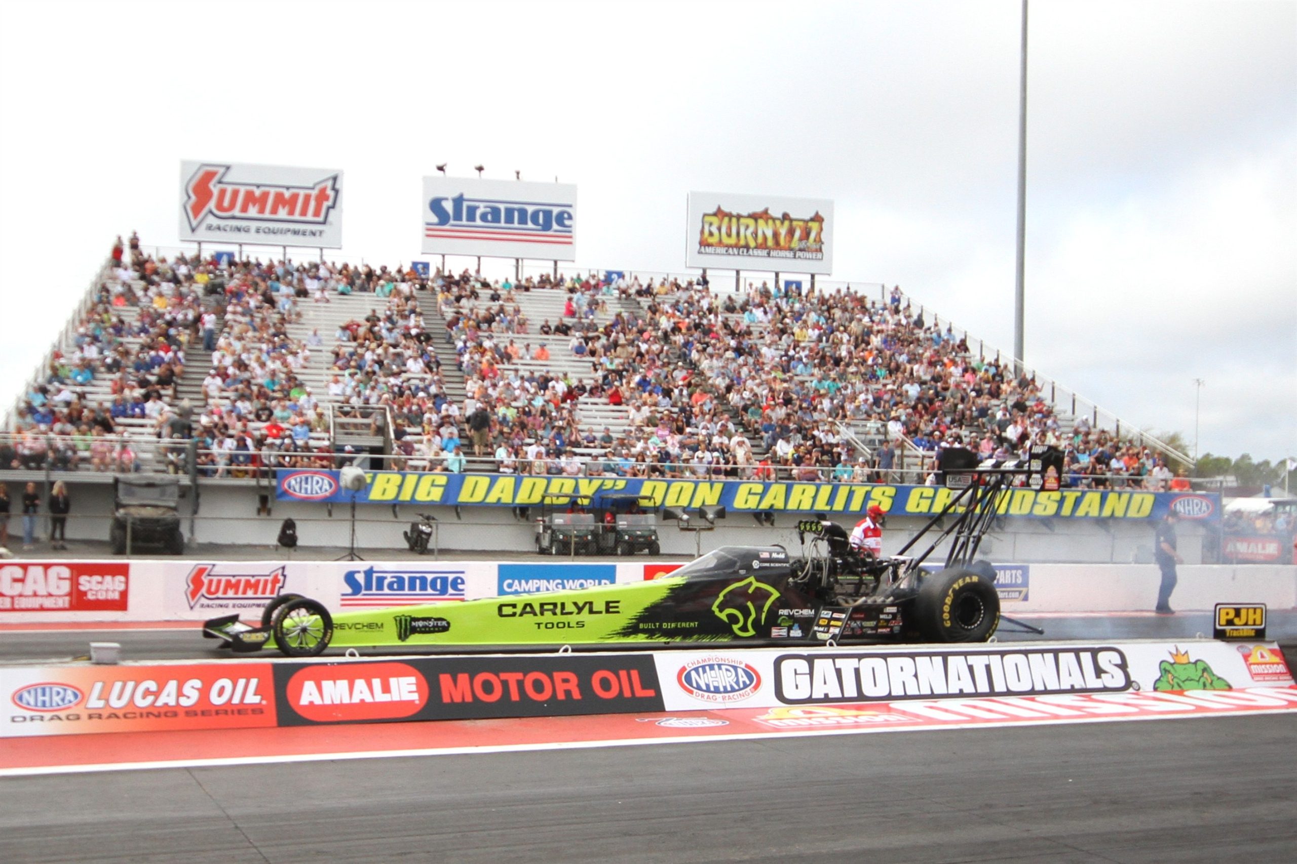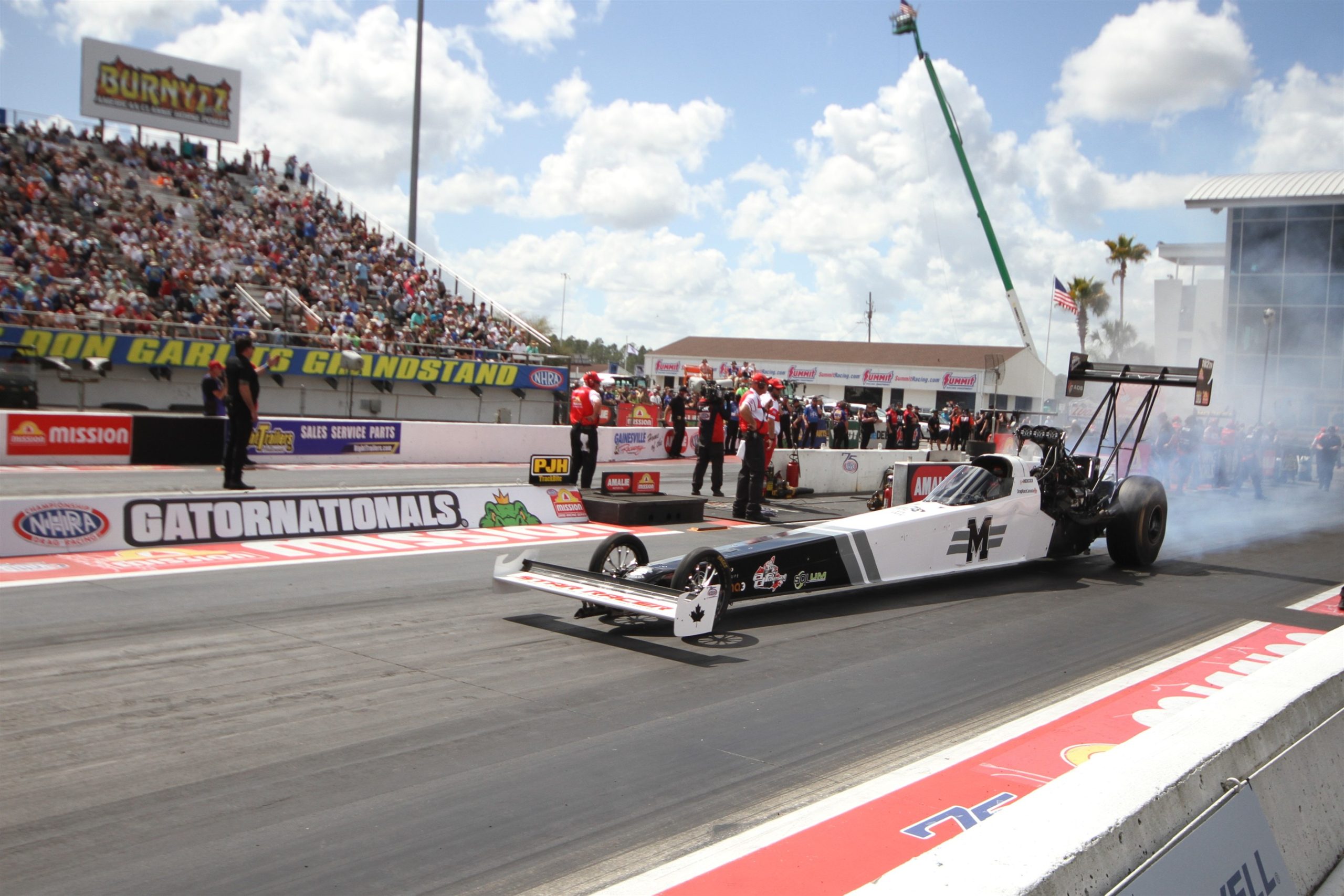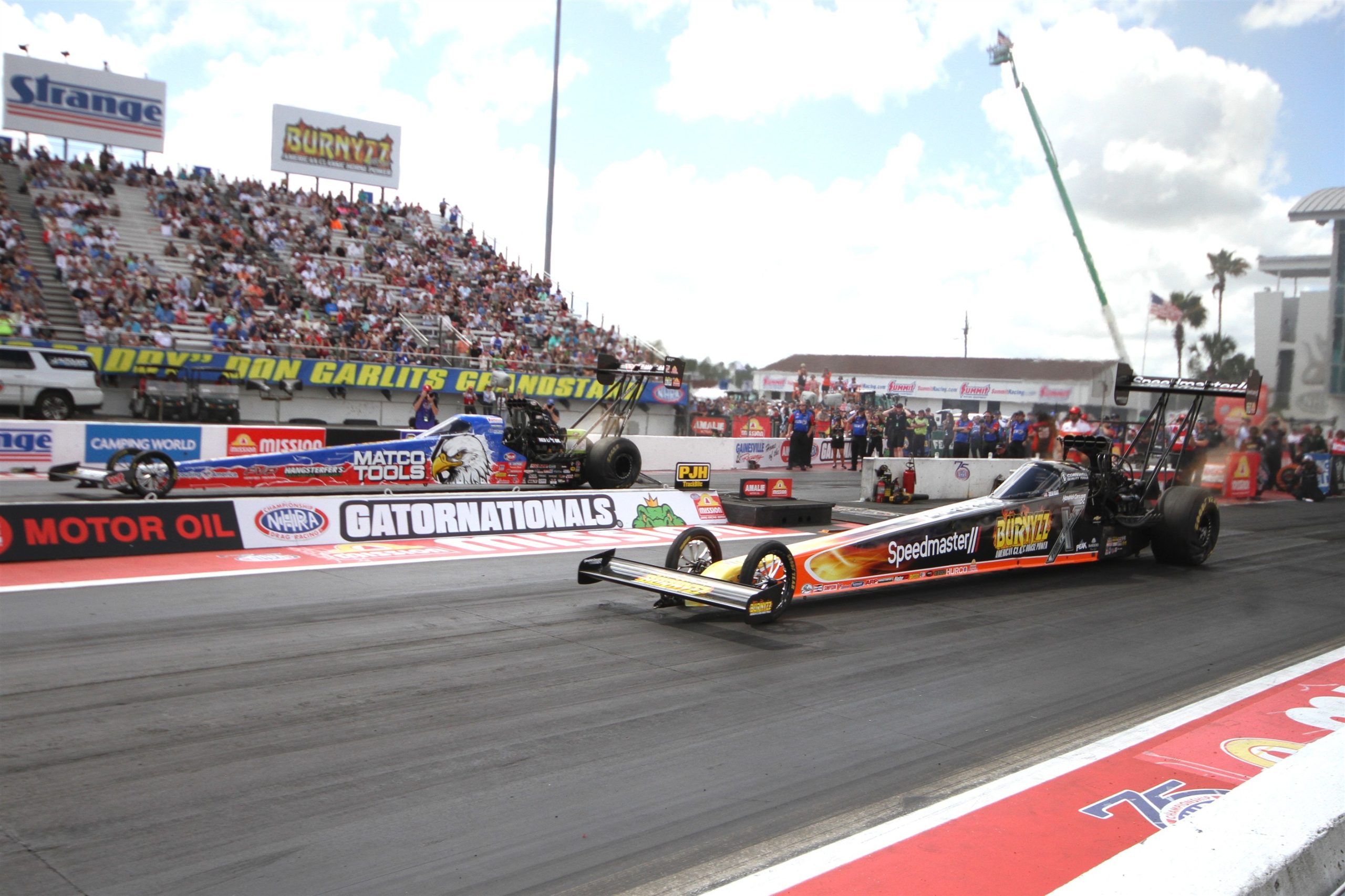 Kenny Bernstein’s shattering of the 300-mph barrier at the 1992 NHRA Gatornationals was voted by fans as the No. 1 highlight of NHRA’s Top 75 Moments.Gainesville Raceway celebrates the NHRA Legends with their Top 75 Drivers presentation.Legends match race final: Bruce Larson def. Joe AmatoTony Stewart’s burnout at the Gatornationals.Antron Brown in the near lane taking on John Force Racing’s Josh Hart.Shawn Reed’s burnout as he prepares to take on Shawn Langdon in the All-Star Callout.Langdon advances as with a 3.789 as he bests Reed who pulled a 3.838Will Smith at the Gatornationals.