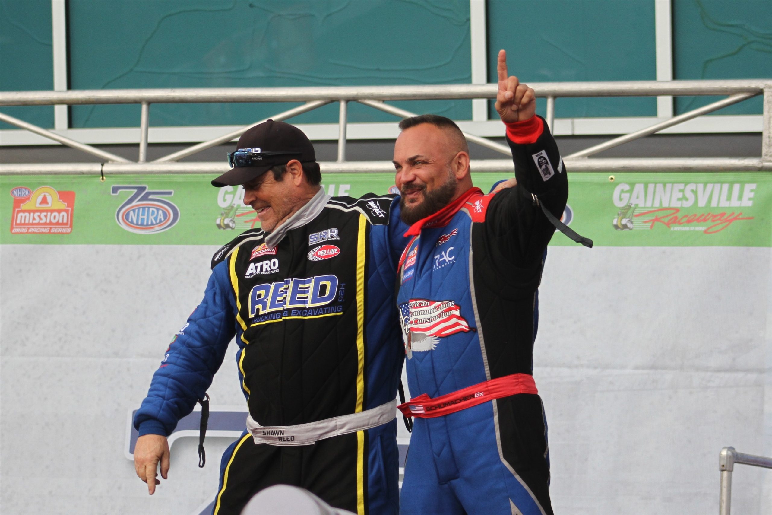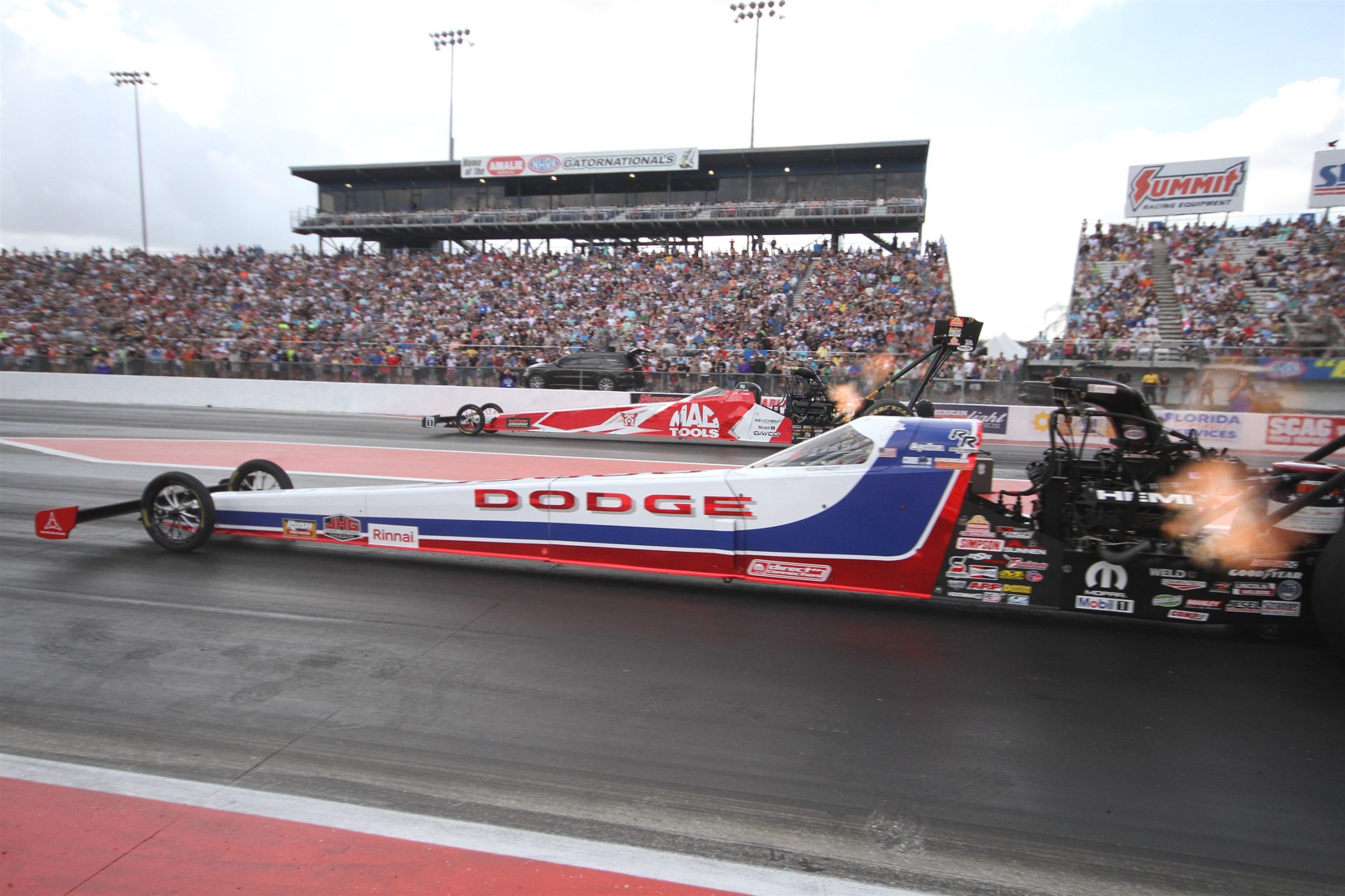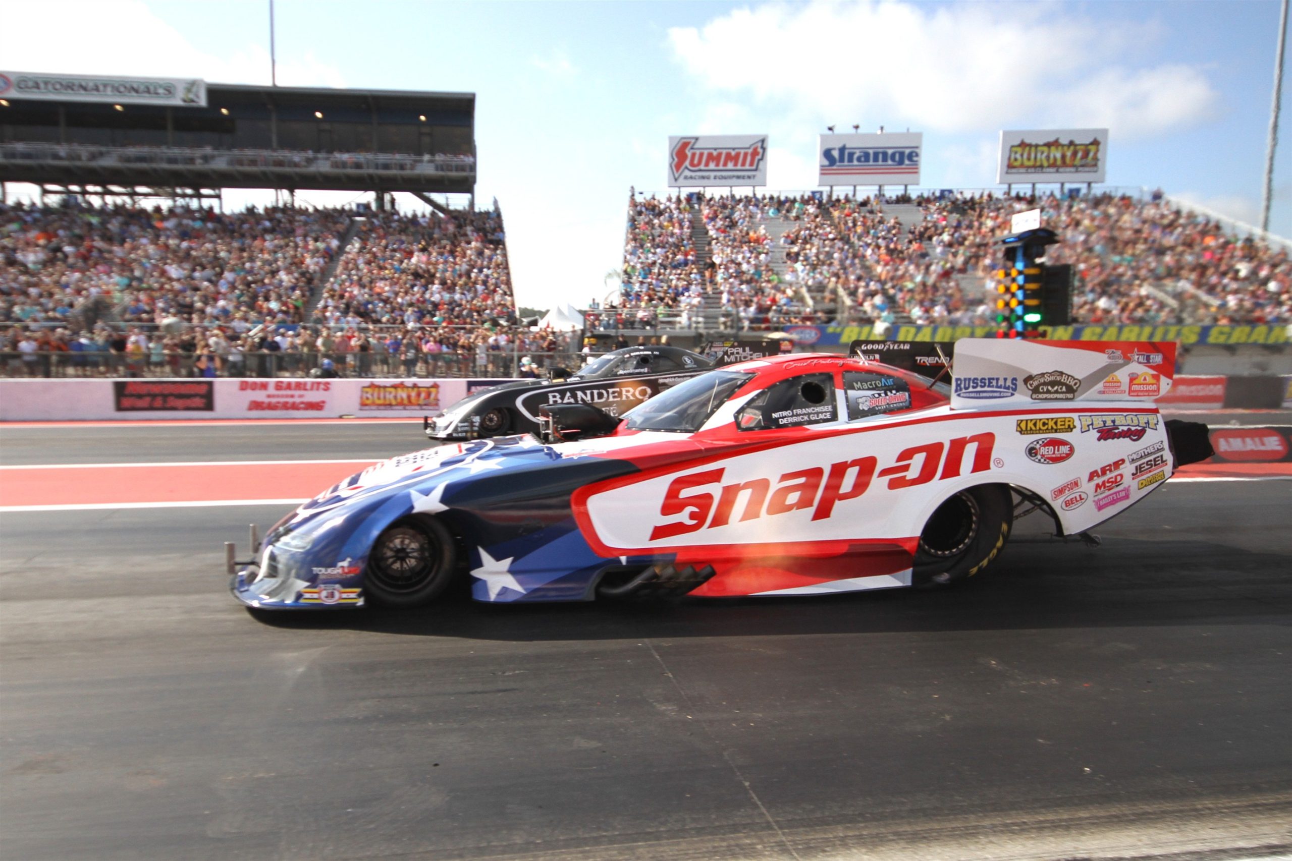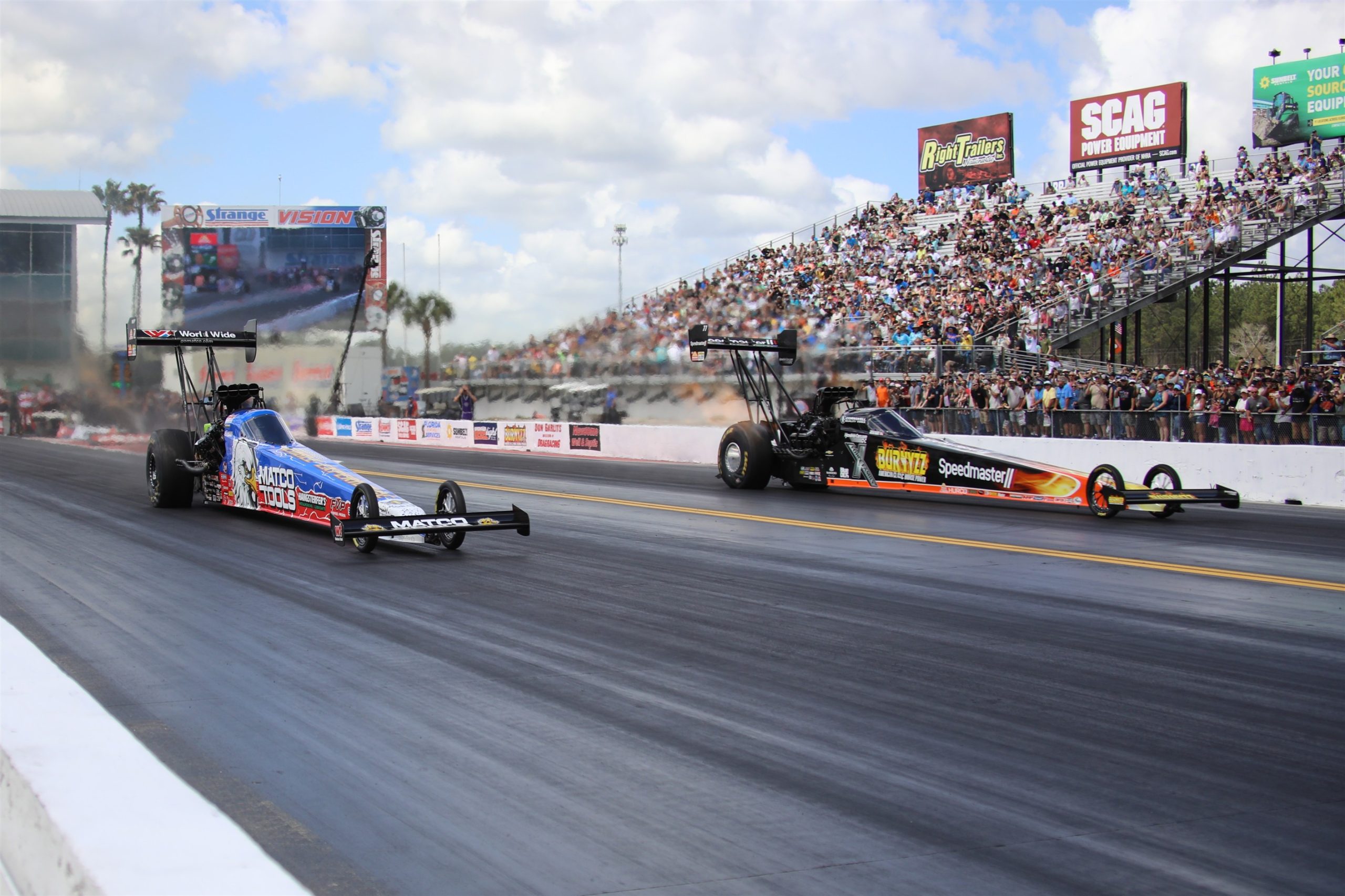 Kenny Bernstein’s shattering of the 300-mph barrier at the 1992 NHRA Gatornationals was voted by fans as the No. 1 highlight of NHRA’s Top 75 Moments.Gainesville Raceway celebrates the NHRA Legends with their Top 75 Drivers presentation.Legends match race final: Bruce Larson def. Joe AmatoTony Stewart’s burnout at the Gatornationals.Antron Brown in the near lane taking on John Force Racing’s Josh Hart.Shawn Reed’s burnout as he prepares to take on Shawn Langdon in the All-Star Callout.Langdon advances as with a 3.789 as he bests Reed who pulled a 3.838Will Smith at the Gatornationals.