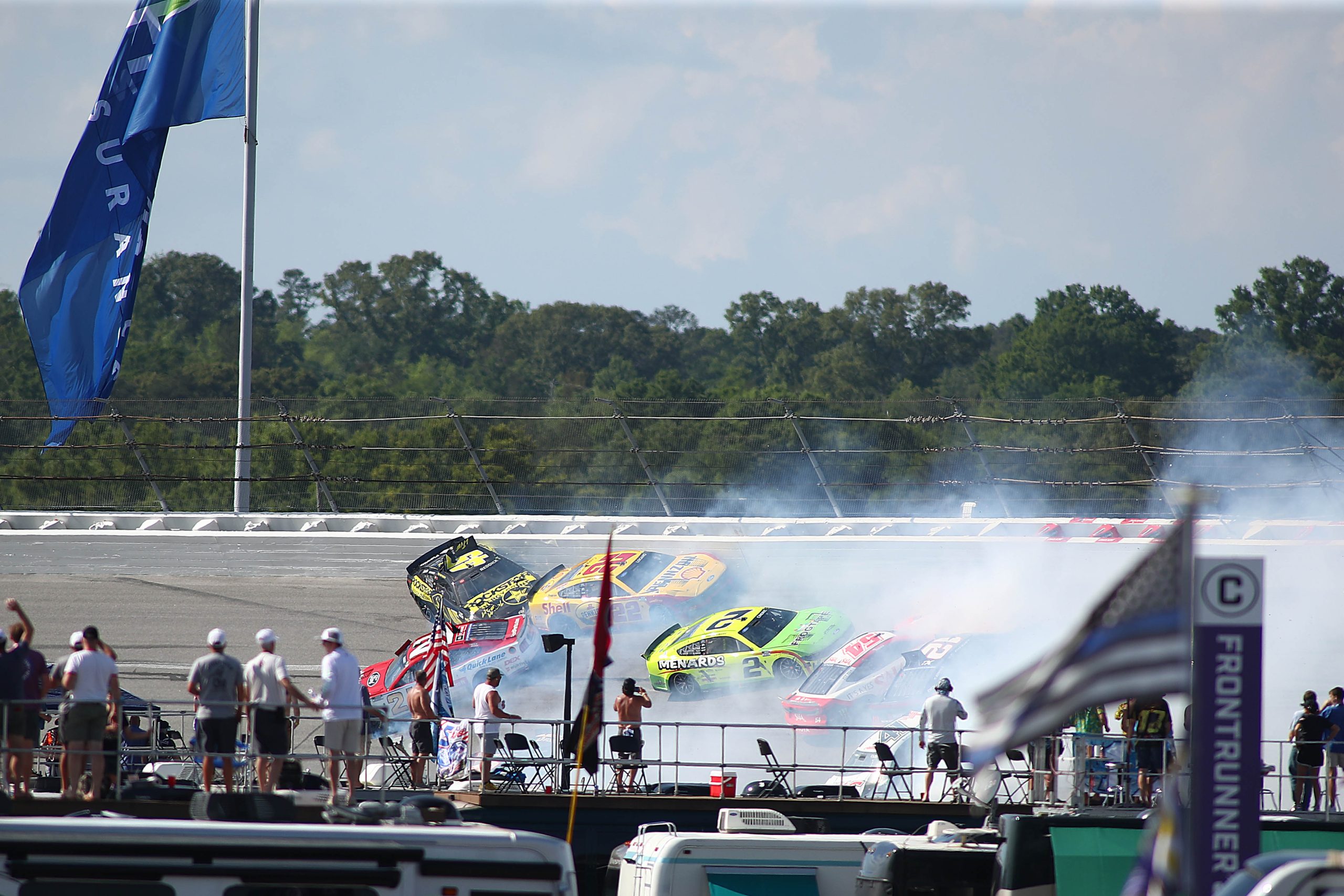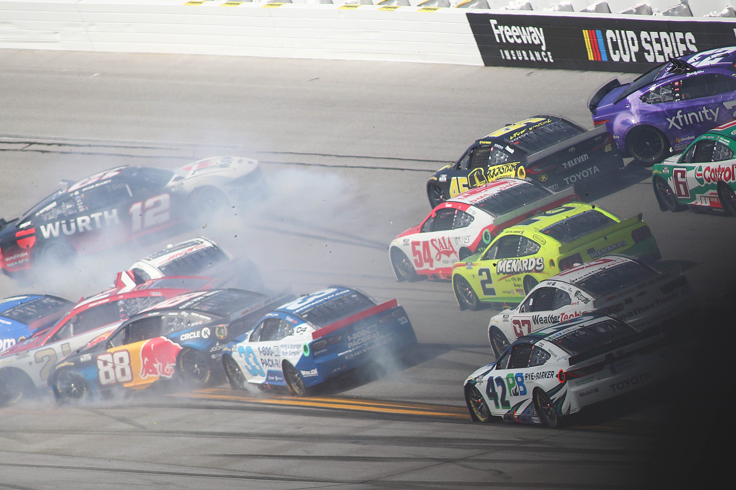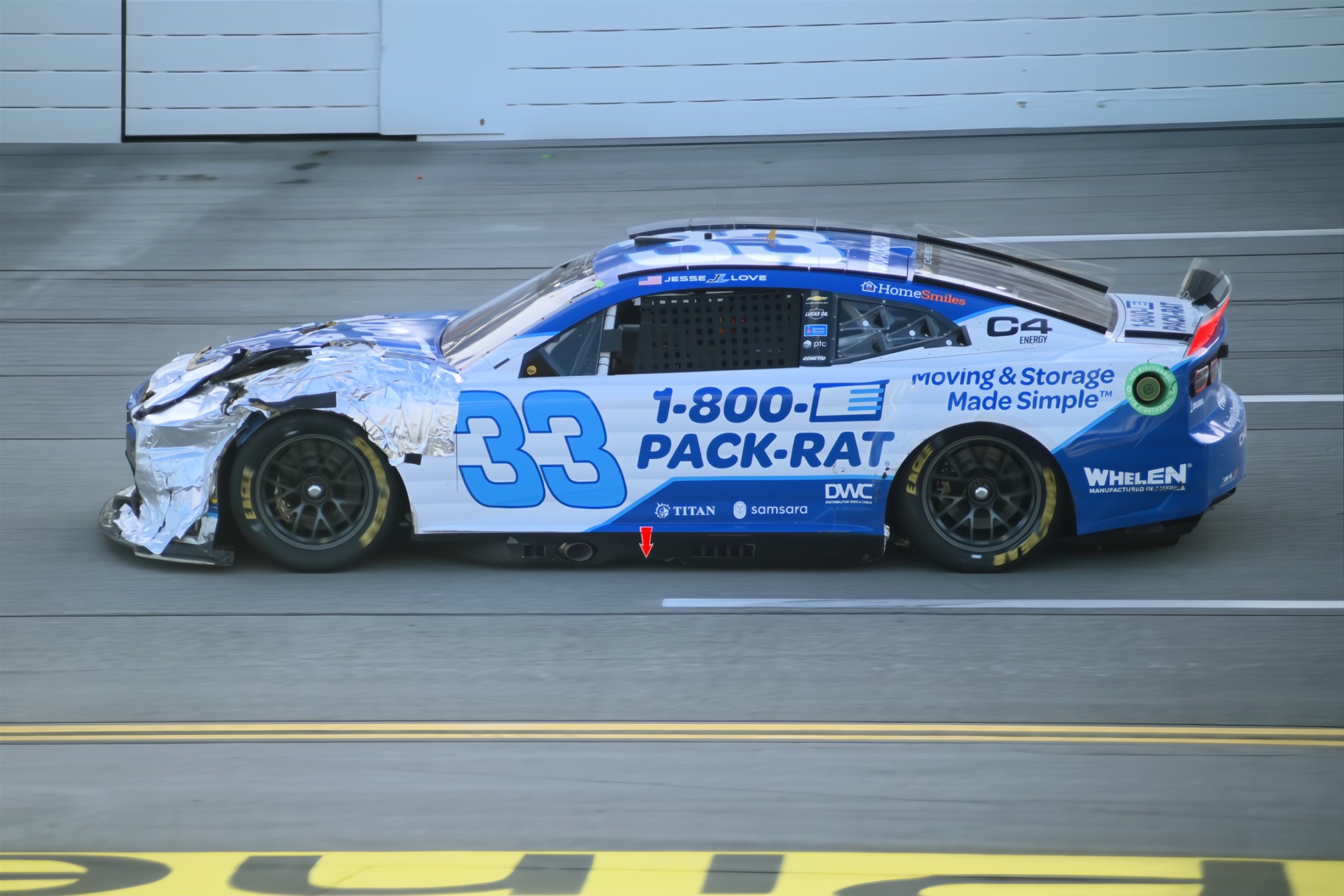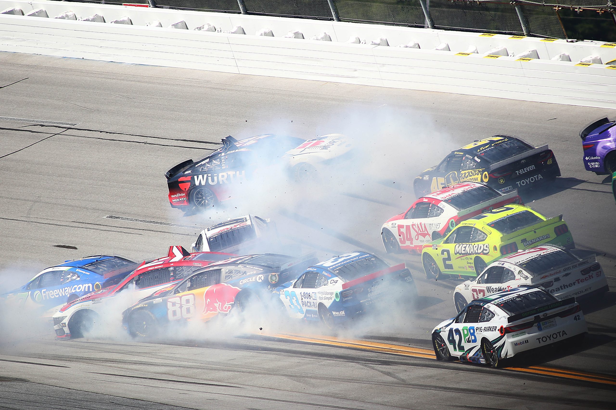 Caution on the backstretch as The Big One happens on Lap # 115 as Wallace gets loose and spins in front of the field!The Big One collected 26 cars!The Big One on the backstretch into Turn 3!NASCAR Fans in Turn 3 at Talladega react to The Big One on Lap # 115!NASCAR Fans in Turn 3 have a great seat for The Big One!Jesse Love shows major damage to his Richard Childress Chevrolet.Carson Hocevar escaped damage in the 26-car crash on Lap # 115.