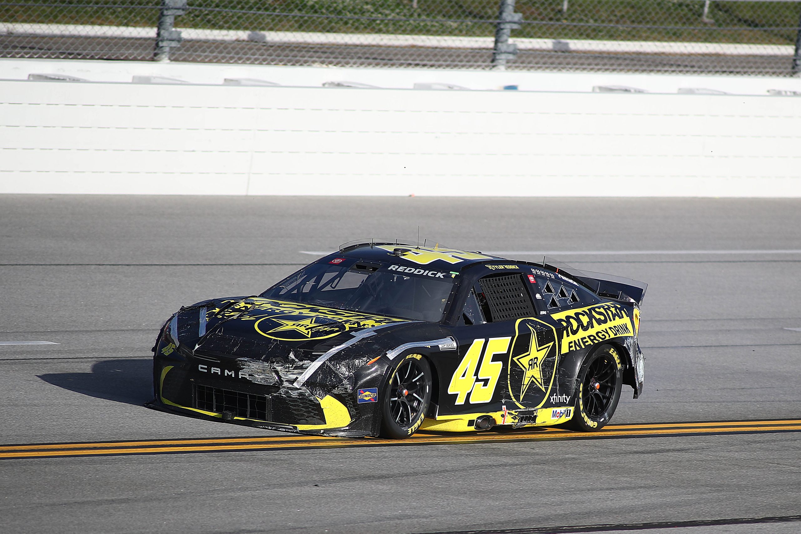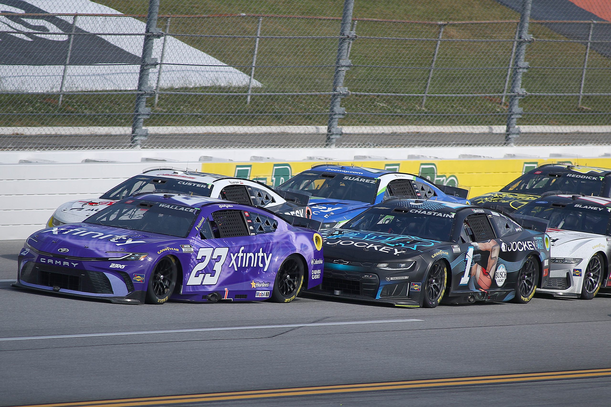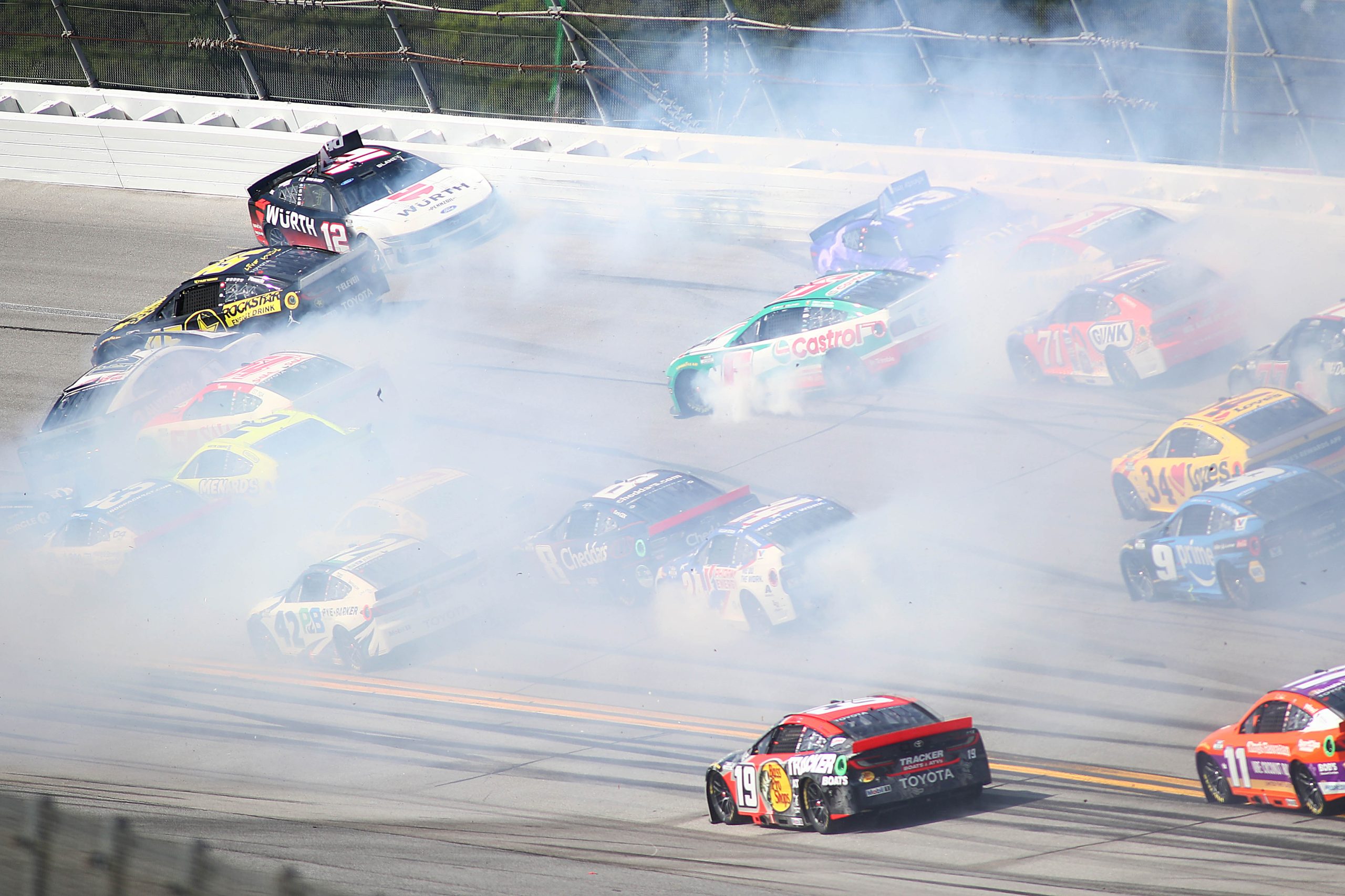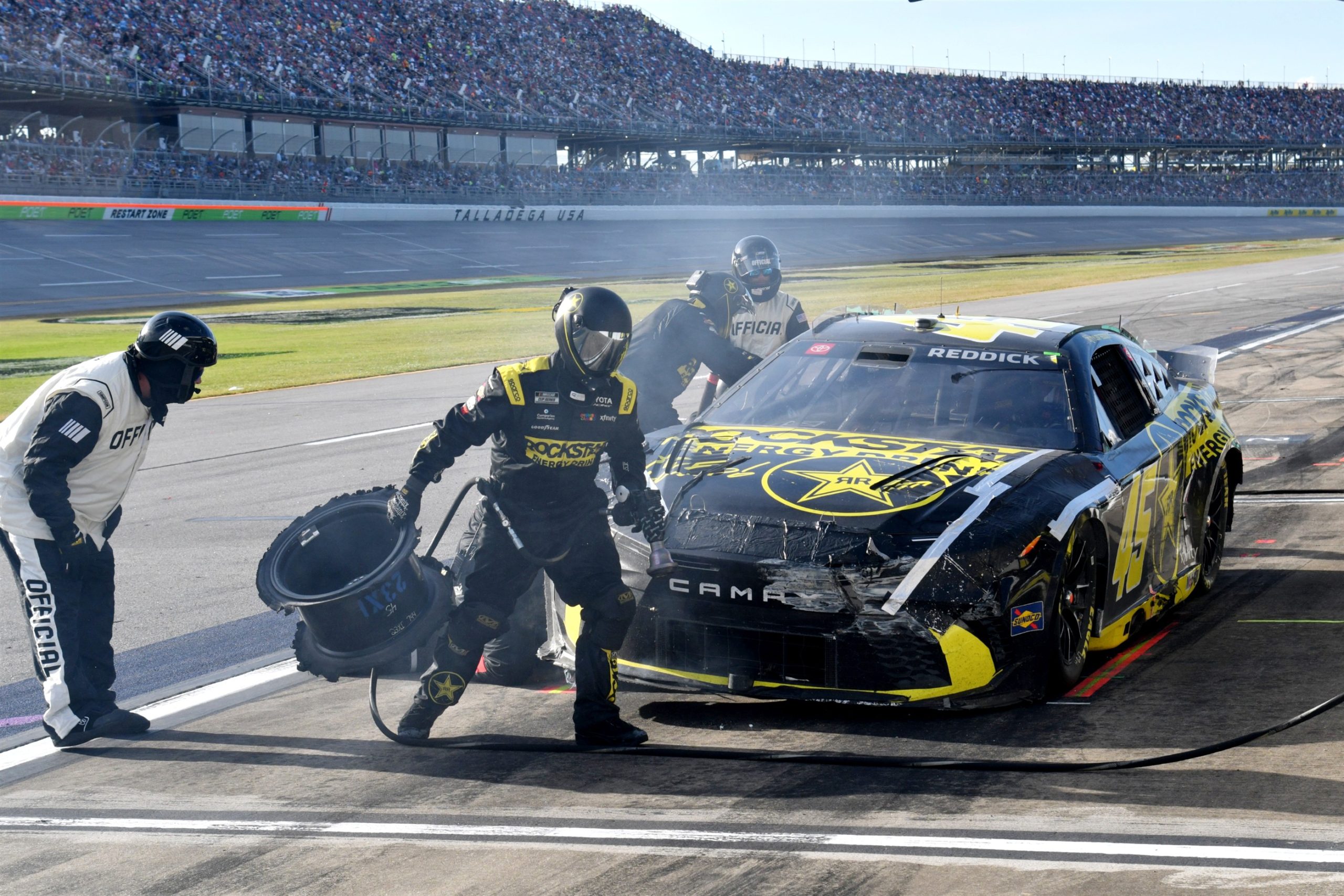 Caution on the backstretch as The Big One happens on Lap # 115 as Wallace gets loose and spins in front of the field!The Big One collected 26 cars!The Big One on the backstretch into Turn 3!NASCAR Fans in Turn 3 at Talladega react to The Big One on Lap # 115!NASCAR Fans in Turn 3 have a great seat for The Big One!Jesse Love shows major damage to his Richard Childress Chevrolet.Carson Hocevar escaped damage in the 26-car crash on Lap # 115.
