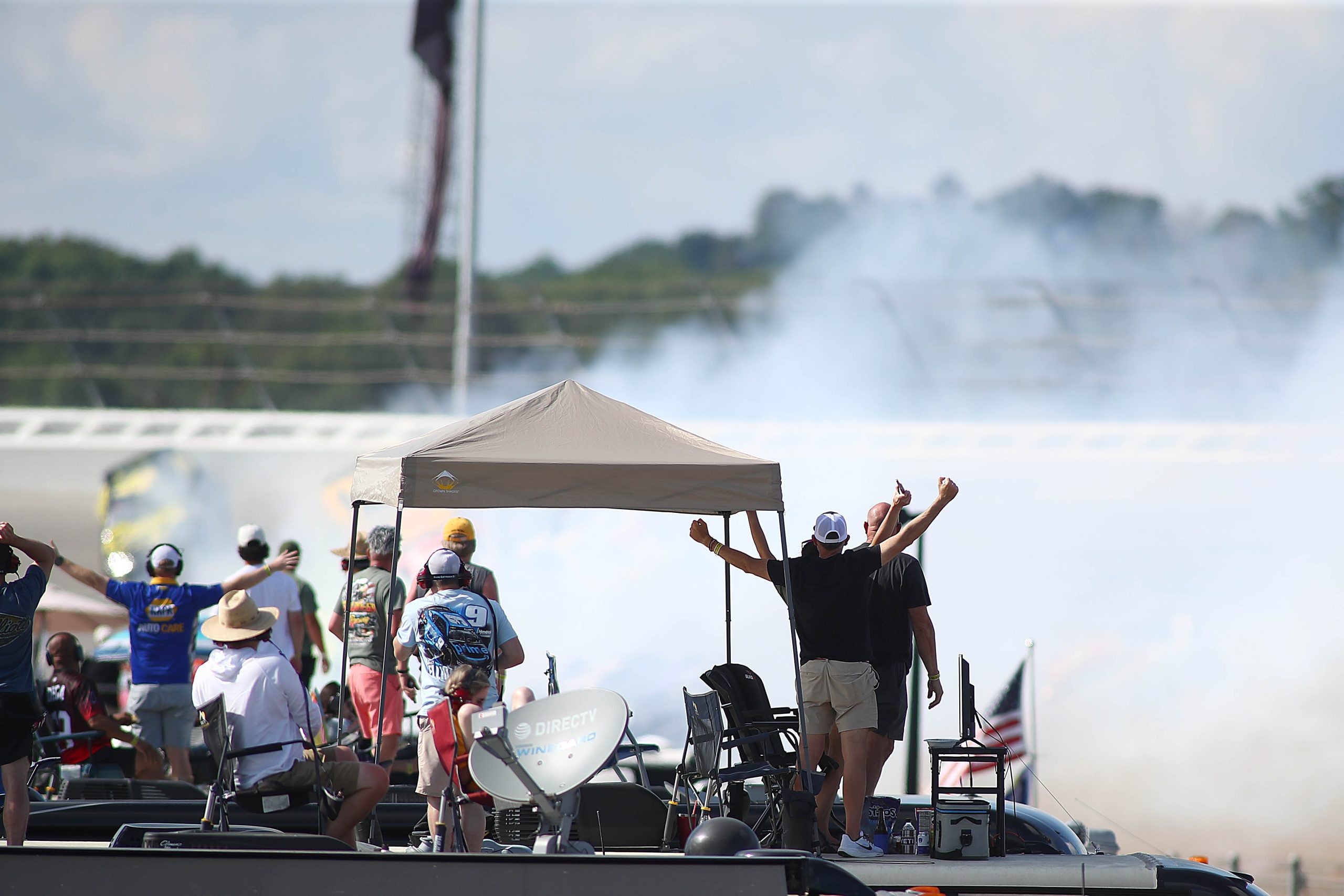 Hocevar steered the car nose-first into the outside wall to perform an epic burnout before climbing onto the roof with fist-pumps that lit up social media platforms with a frenzy.