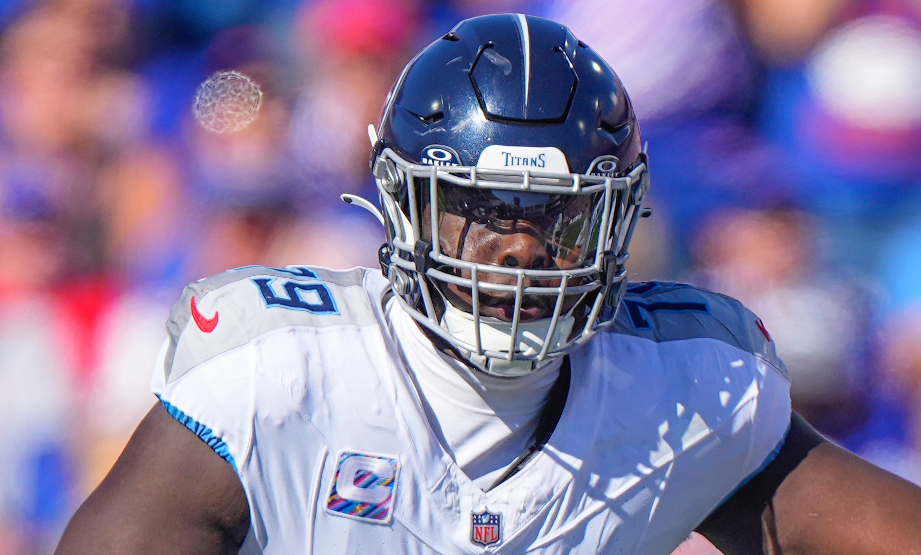 Oct 20, 2024; Orchard Park, New York, USA; Tennessee Titans center Lloyd Cushenberry III (79) looks to block against the Buffalo Bills during the first half at Highmark Stadium. Mandatory Credit: Gregory Fisher-Imagn Images