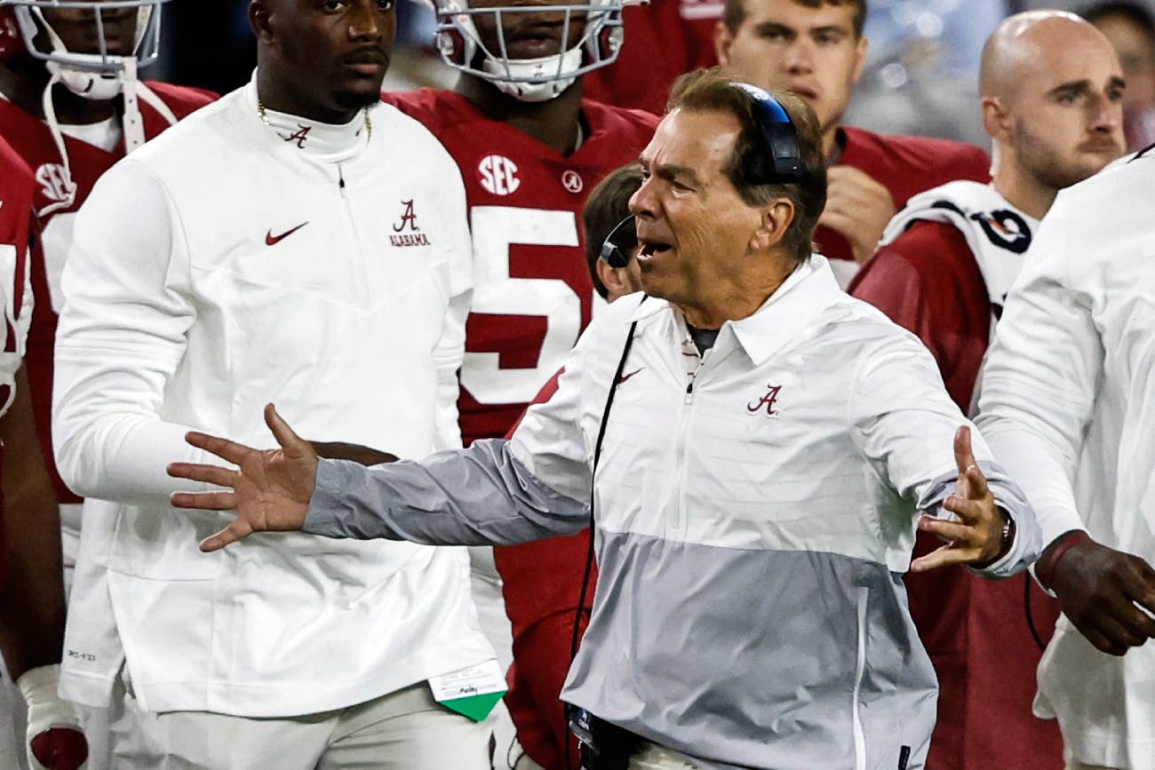 Former Alabama Crimson Tide head coach Nick Saban reacts after a penalty..