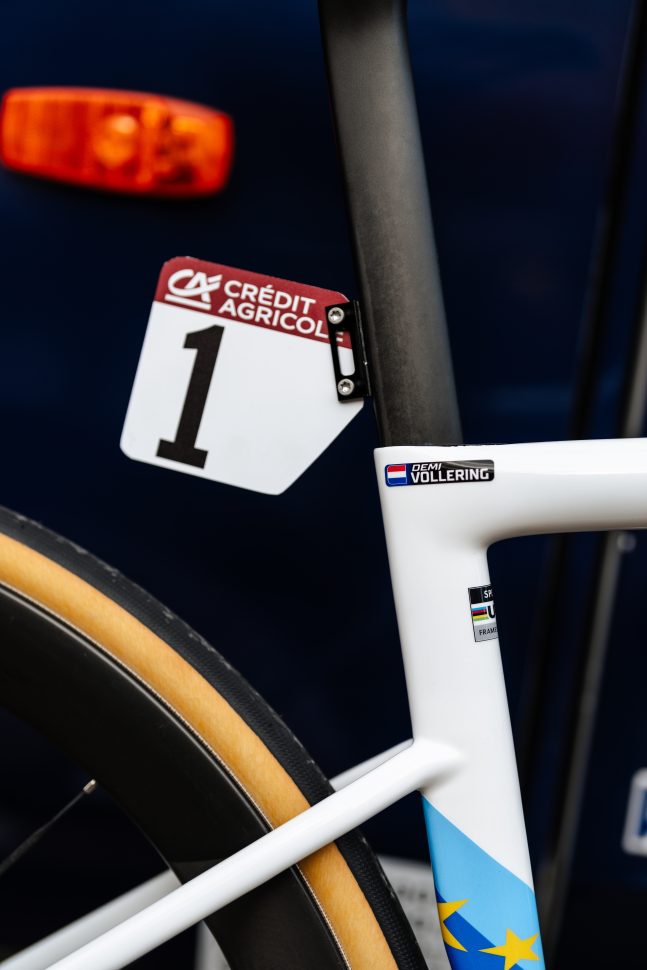 Since claiming the European Championships last autumn, FDJ United-Suez’s Demi Vollering has swapped her usual team colours for the blue bands and stars of continental champion. To match, her Specialized Tarmac SL8 has received a suitable Euro makeover, with enough blue and yellow to make even Ursula von der Leyen smile.