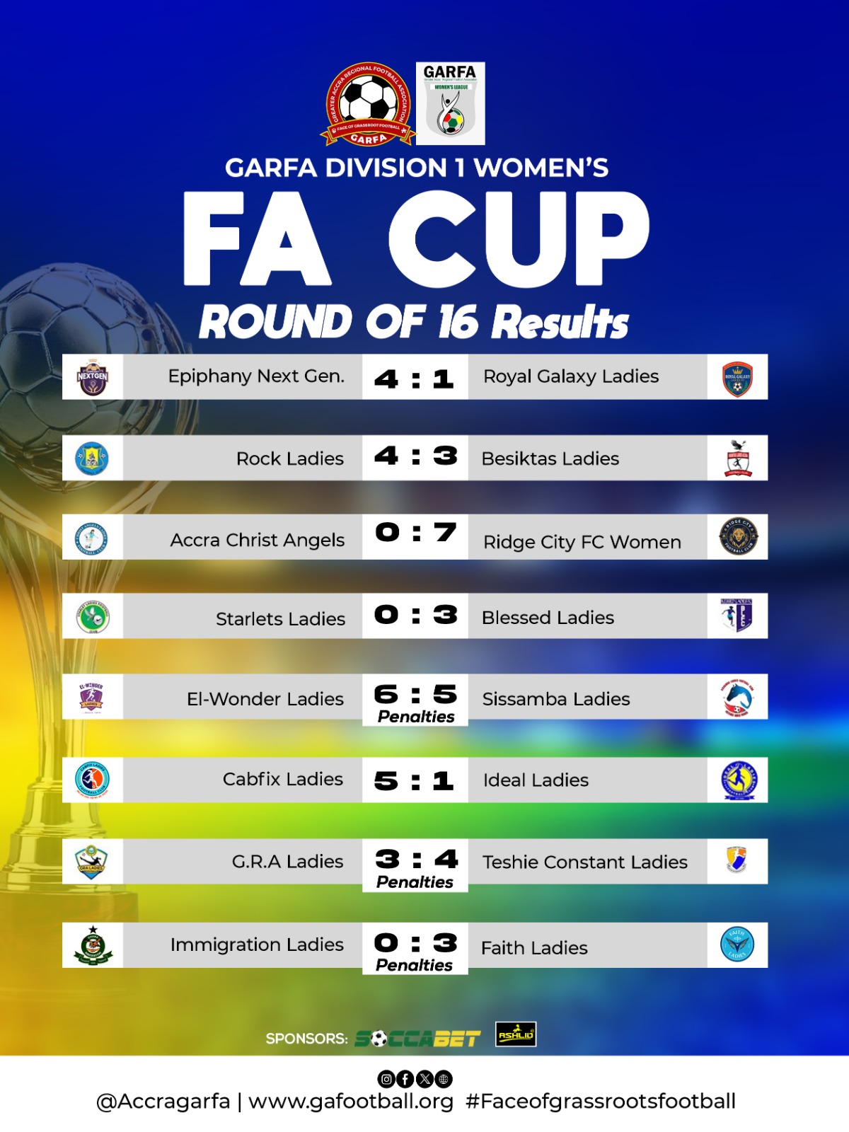 With the quarter-final stage now set, attention turns to the next round as clubs intensify preparations in pursuit of the 2025/26 GARFA Women’s Division One FA Cup title, in a competition that continues to elevate women’s football across the Greater Accra Region.