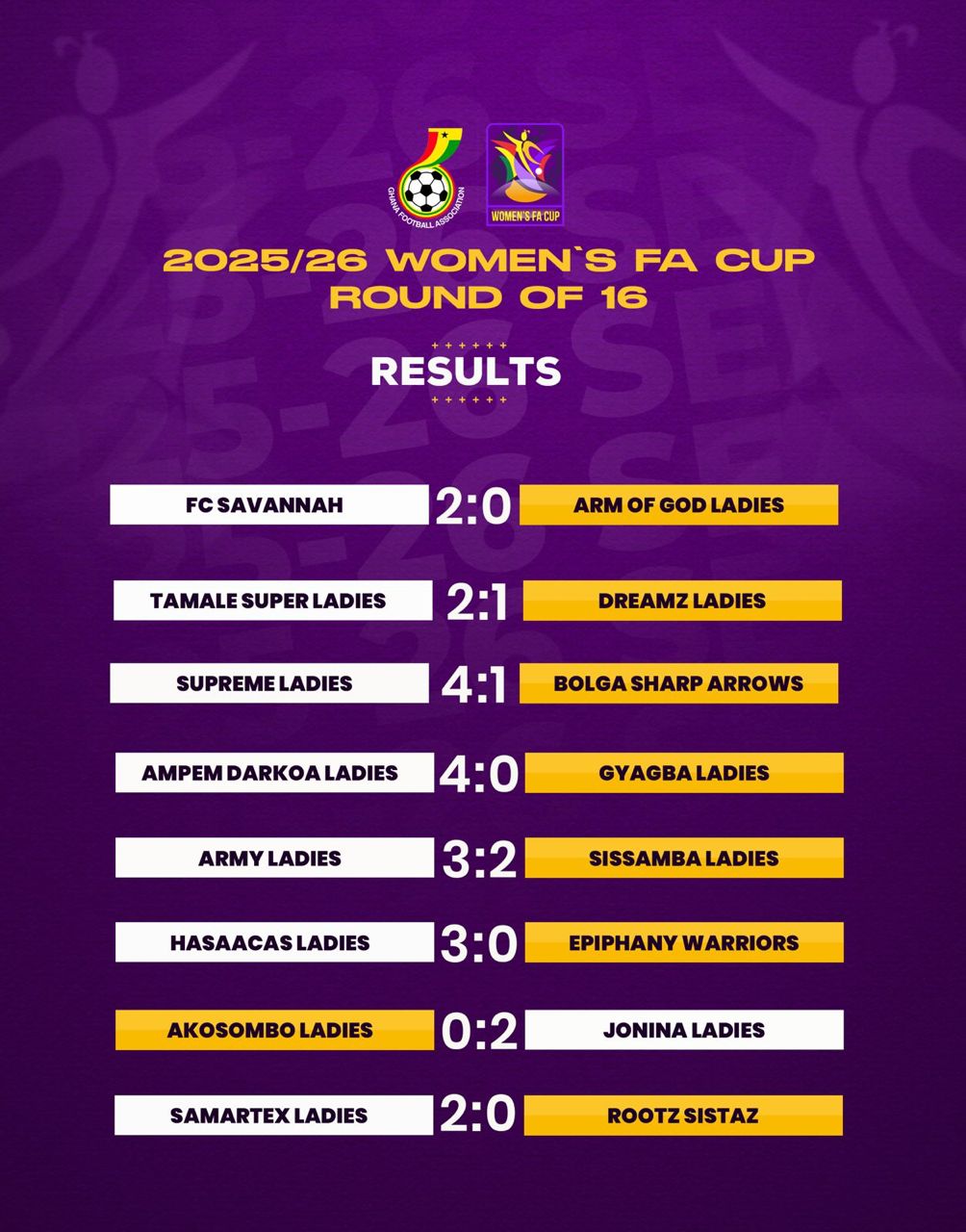 The final quarter-final spot was secured by Samartex Ladies, who recorded a 2–0 victory over Rootz Sistaz, halting the impressive run of the Eastern Region Division One side who had shocked Ladystrikers in the previous round.