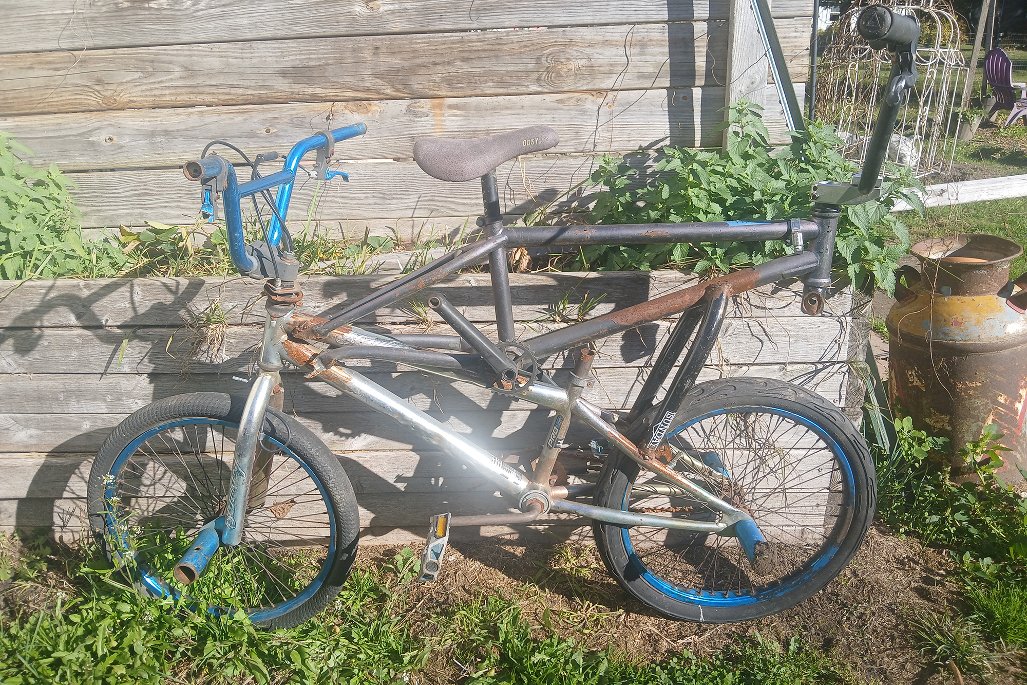 My buddy Richie…aka Stoopidtall…aka one time Guiness World Record holder tallest bike rider…and overall just a really nice dude. He let me peruse through the Detroit Freakbike Experience’s extensive collection of bikes so that I could keep this on the cheap. So I found this unfinished mini tall BMX tall bike that fit the bill. It wasn’t even a face a mother could love. I just wanted the top frame that was a newer Fit freestyle bike as it had an integrated head tube, Mid BB shell, decent cranks and stem. Once home I freed it from the depths of eternal bicycle doom so it can spread its ferrous wings to be reborn into the two wheeled Phoenix it yearned to be. I also realized this build is beginning to read like the bicycle version of Frankenstein.